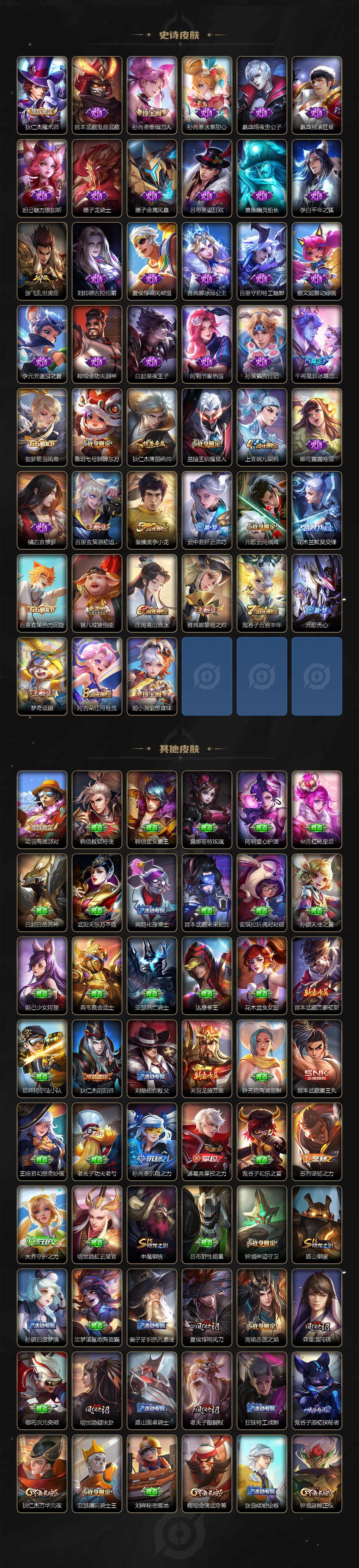 【史诗皮肤】:露娜紫霞仙子,钟无艳王者之锤,赵云皇家上将,赵云未来纪元,甄姬冰雪圆舞曲,王昭君偶像歌手,狄仁杰魔术师,宫本武藏鬼剑武藏,孙尚香蔷薇恋人,孙尚香水果甜心,嬴政暗夜贵公子,嬴政摇滚巨星,妲己魅力维加斯,墨子龙骑士,墨子金属风暴,吕布圣诞狂欢,曹操幽灵船长,李白千年之狐,张飞乱世虎臣,刘邦德古拉伯爵,夏侯惇乘风破浪,雅典娜冰冠公主,百里守约特工魅影,蔡文姬舞动绿茵,李元芳逐浪之夏,程咬金功夫厨神,白起星夜王子,阿轲节奏热浪,孙策猫狗日记,干将莫邪冰霜恋舞曲,伽罗箭羽风息,鲁班七号狮舞东方,狄仁杰鹰眼统帅,兰陵王驯魔猎人,上官婉儿梁祝