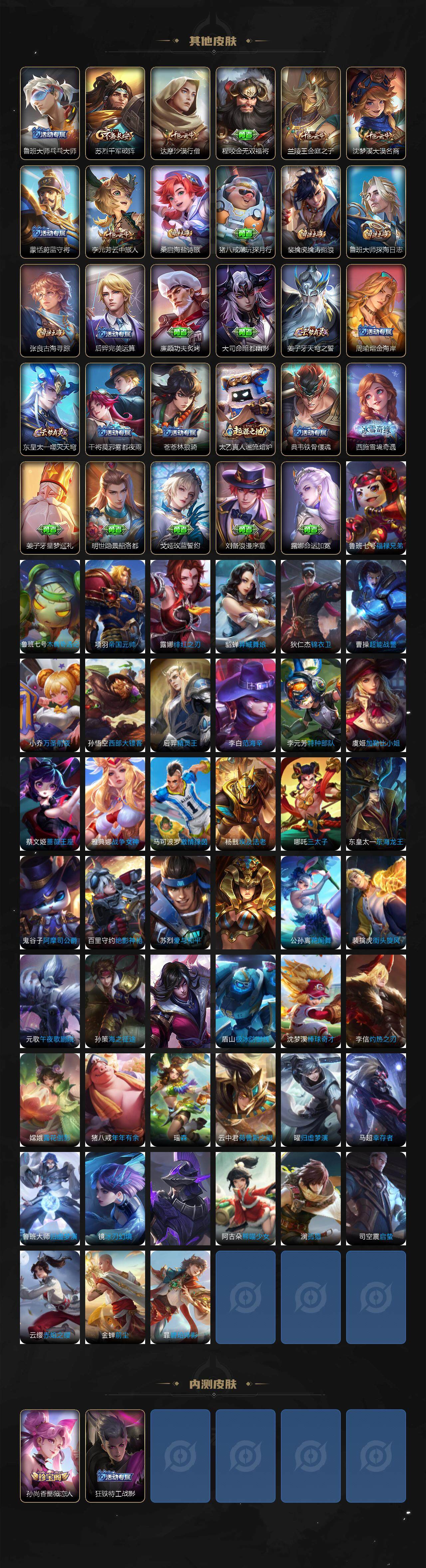 【限定皮肤】:姜子牙天穹之誓,狄仁杰阴阳师,赵云皇家上将,孙尚香蔷薇恋人,鲁班七号狮舞东方,庄周高山流水,钟无艳王者之锤,周瑜赤莲之焰,元歌云间偶戏,元歌无心,夏侯惇朔风刀,狄仁杰魔术师,狄仁杰万华元夜,达摩沙漠行僧,项羽海滩派对,老夫子醍醐杖,程咬金演武夺筹,兰陵王驯魔猎人,兰陵王金庭之子,花木兰默契交锋,亚瑟潮玩骑士王,孙悟空零号赤焰,牛魔御旌,李元芳云中旅人,钟馗神迹守卫,钟馗驱傩正仪,干将莫邪冰霜恋舞曲,雅典娜黎明之约,鬼谷子原初探秘者,鬼谷子五谷丰年,诸葛亮时雨天司,苏烈千军破阵,百里玄策原初追逐者,弈星混沌棋,梦奇顽趣,沈梦溪大漠名商,明世隐疑决卦,裴擒虎李小龙,裴擒虎擒涛扼浪,云中君纤云弄巧,盾山御銮,猪八戒猪悟能,上官婉儿梁祝,鲁班大师探海日志,桑启海盐诗旅,阿古朵江河有灵,张良古海寻踪,姬小满妄想食味,周瑜熔金海岸
