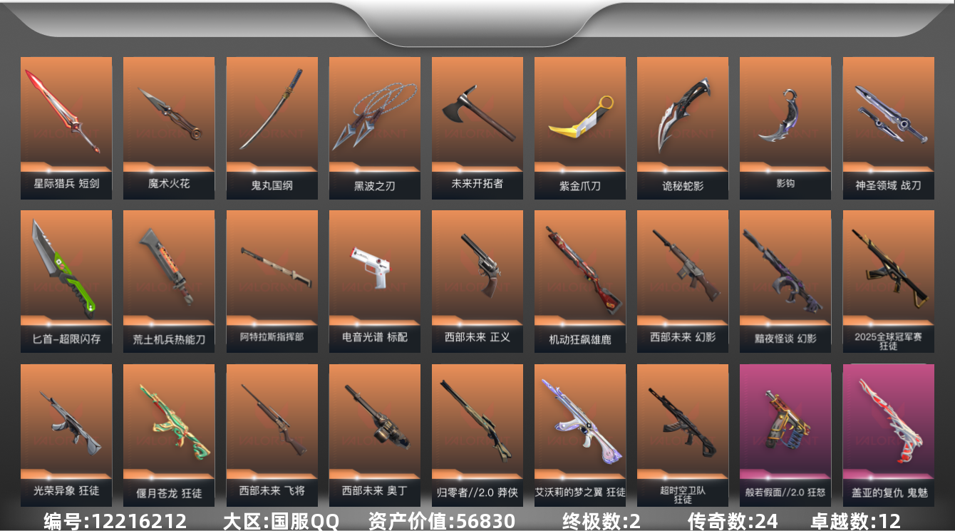 [12216212]24橙皮 2金皮 12紫皮 122皮肤 27英雄 154卡面 1400已用源晶 铂金 优质装备:狂徒-艾沃莉的梦之翼,狂徒-掠影,狂徒-紫阙金琅,狂徒-盖亚的复仇,狂徒-偃月苍龙,狂徒-日冕雄师,幻影-黯夜怪谈,戍卫-掠影,鬼魅-盖亚的复仇,冥驹-起源,雄鹿-机动狂飙,紫金爪刀,黑波之刃,匕首-超限闪存,荒土机兵热能刀,鬼丸国纲,神圣领域 战刀,未来开拓者,诡秘蛇影,阿特拉斯指挥部,影钩,魔术火花,星际猎兵 短剑,2025全球冠军赛 狂徒 套装:般若假面//2.0套装,西部未来 佩枪皮肤:狂怒-般若假面//2.0,标配-电音光谱,正义-西部未来 步枪皮肤:幻影-西部未来,狂徒-般若假面//2.0,獠犬-般若假面//2.0,狂徒-超时空卫队,狂徒-光荣异象,狂徒-离子武器2.0 狙击枪皮肤:莽侠-归零者//2.0,飞将-西部未来 机枪皮肤:奥丁-西部未来,战神-般若假面//2.0