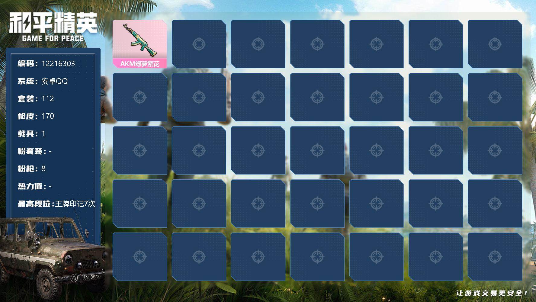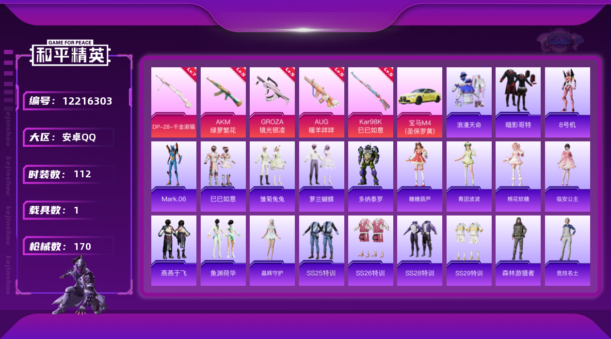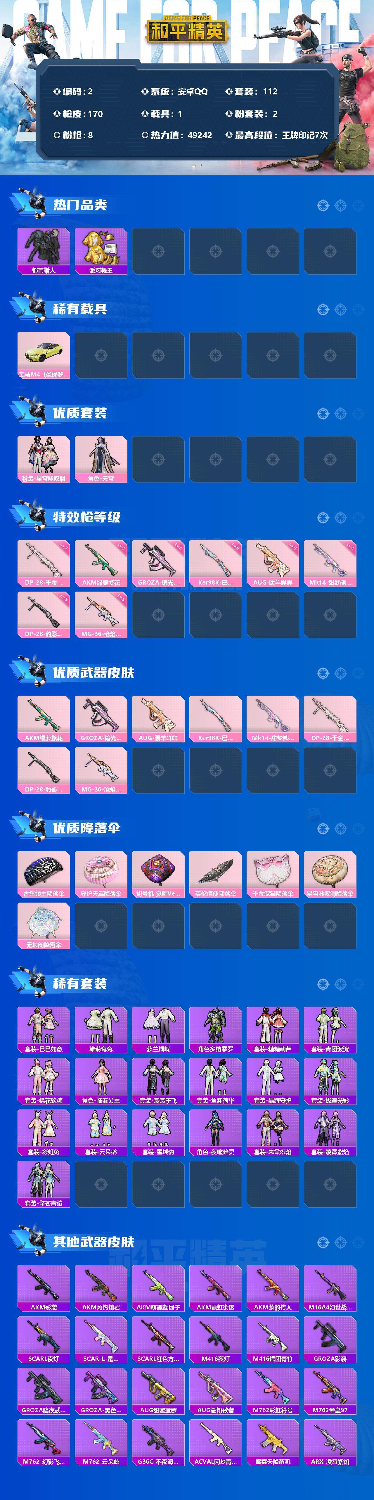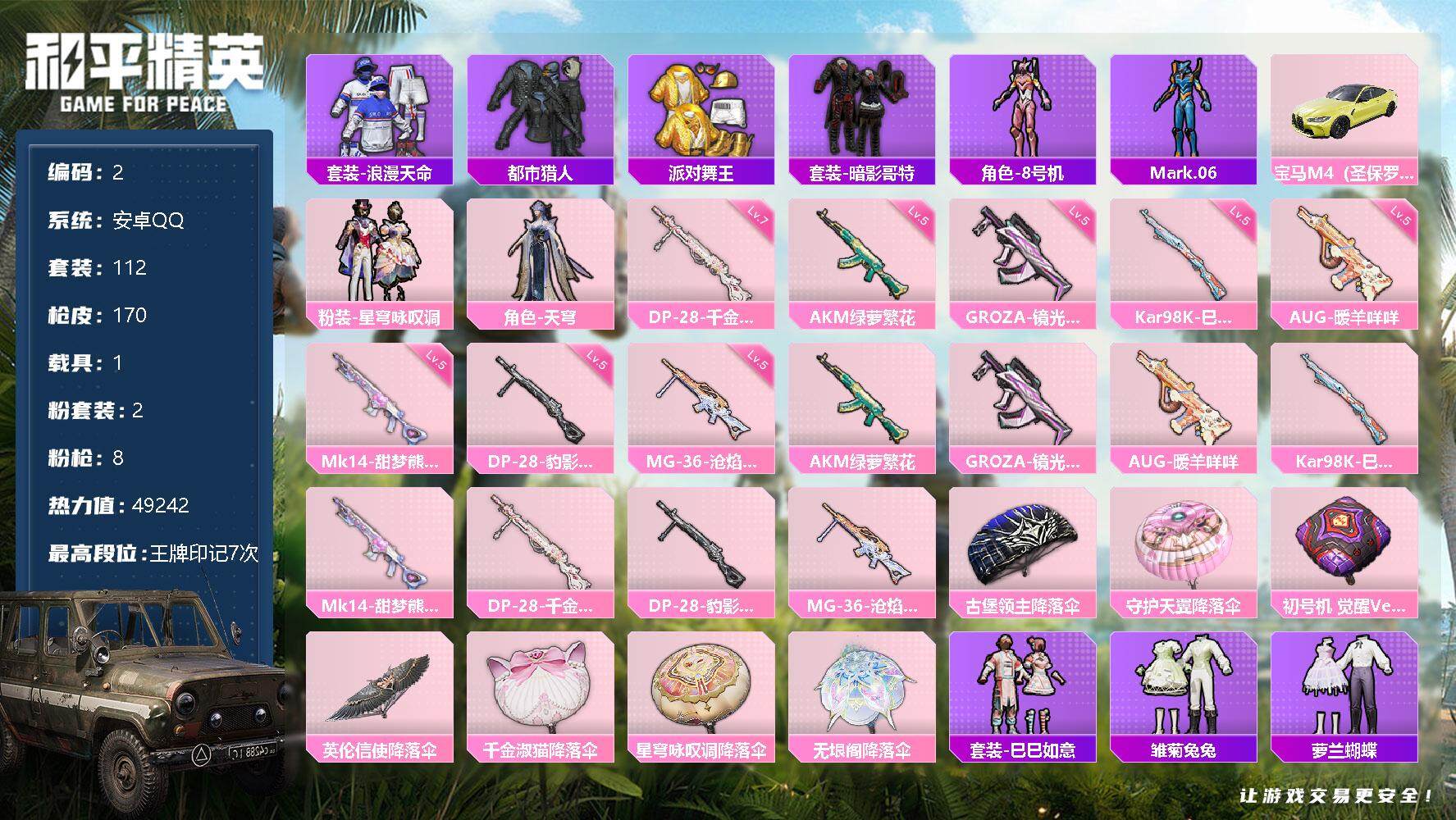 [12216344][12216305][12216303]【商品标题】:安卓 手Q-2粉装-8特效枪-1载具-2粉色飞行器-49242热力值-7王牌印记-112套装-170枪皮 【热门品类】:套装-浪漫天命,套装-都市猎人,套装-派对舞王,套装-暗影哥特,角色-8号机,角色-Mark.06 【粉色载具】:宝马M4(圣保罗黄) 【粉色套装】:粉装-星穹咏叹调,角色-天穹 【粉色枪皮等级】:AKM-绿萝繁花(五级),GROZA-镜光银凌(五级),AUG-暖羊咩咩(五级),Kar98K-巳巳如意(五级),Mk14-甜梦熊击(五级),DP-28-千金淑猫(七级),DP-28-豹影疾电(五级),MG-36-沧焰双生(五级) 【粉色枪皮】:AKM-绿萝繁花,GROZA-镜光银凌,AUG-暖羊咩咩,Kar98K-巳巳如意,Mk14-甜梦熊击,DP-28-千金淑猫,DP-28-豹影疾电,MG-36-沧焰双生 【粉色降落伞】:古堡领主降落伞,守护天翼降落伞,初号机 觉醒Ver.降落伞,英伦信使降落伞,千金淑猫降落伞,星穹咏叹调降落伞,无垠阁降落伞 【稀有套装】:套装-巳巳如意,套装-雏菊兔兔,套装-萝兰蝴蝶,角色-多纳泰罗,套装-糖糖葫芦,套装-青团波波,套装-棉花软糖,角色-临安公主,套装-燕燕于飞,套装-鱼渊荷华,套装-晶辉守护,套装-极速光影,套装-彩虹兔,套装-云朵鹅,套装-雪绒豹,角色-夜瞳黯灵,套装-朱霞炽焰,套装-凌霄紫焰,套装-擎苍青焰 【稀有枪皮】:AKM-影袭,AKM-灼热熔岩,AKM-萌趣颜团子,AKM-霓虹街区,AKM-龙的传人,M16A4-幻世战舞者,SCAR-L-夜灯,SCAR-L-是爱神辣,SCAR-L-红色方程式,M416-夜灯,M416-糯团青竹,GROZA-影袭,GROZA-暗夜武装,GROZA-黑色刀锋,AUG-甜蜜菠萝,AUG-耀粉歌者,M762-彩虹符号,M762-拳皇97,M762-云朵鹅,M762-幻影飞狐,G36C-不夜海上花,AC-VAL-闲梦青缨,蜜獾-天降萌叽,ARX-凌霄紫焰,UZI-影袭,UMP45-夜灯,UMP45-蓝色火焰,Vector-彩虹符号,汤姆逊-天降萌叽,汤姆逊-耀粉歌者,JS9-凌霄紫焰,P90-巳巳如意,Kar98K-彩虹符号,Kar98K-影袭,M24-影袭,M24-香水柠檬,M24-冰封烈焰,M24-奇异狩猎者,AWM-