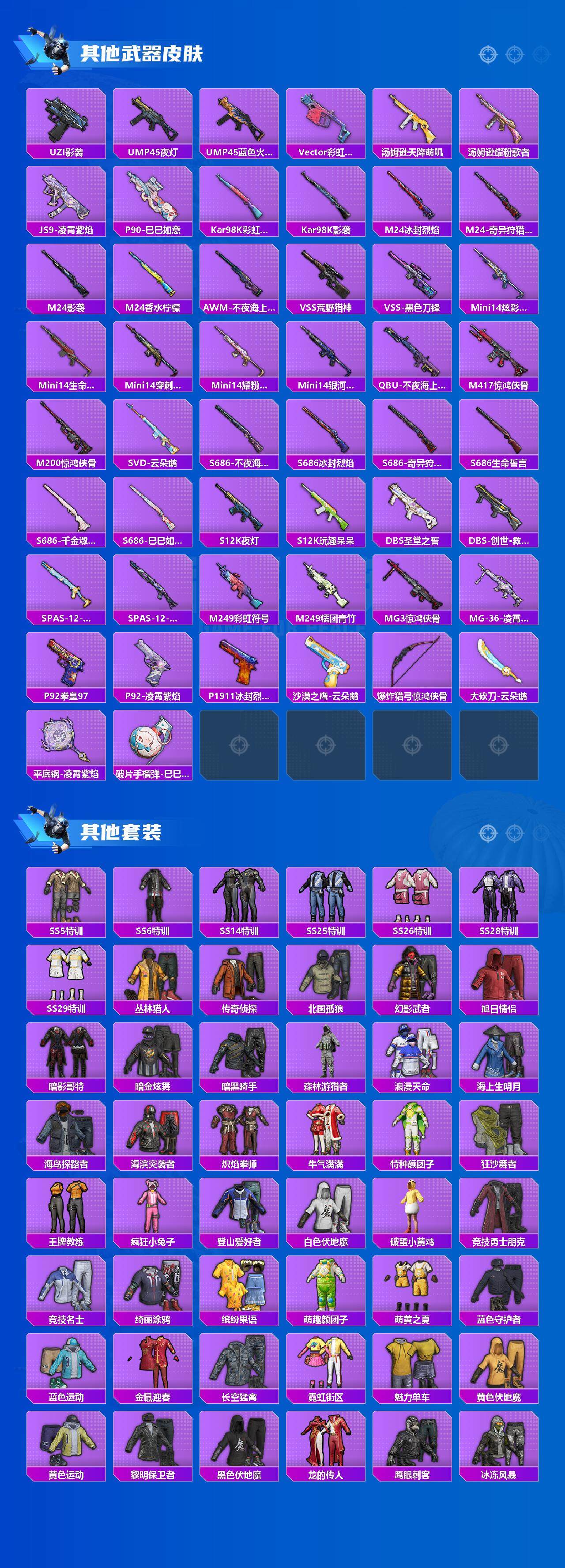【稀有枪皮】:AKM-影袭,AKM-灼热熔岩,AKM-萌趣颜团子,AKM-霓虹街区,AKM-龙的传人,M16A4-幻世战舞者,SCAR-L-夜灯,SCAR-L-是爱神辣,SCAR-L-红色方程式,M416-夜灯,M416-糯团青竹,GROZA-影袭,GROZA-暗夜武装,GROZA-黑色刀锋,AUG-甜蜜菠萝,AUG-耀粉歌者,M762-彩虹符号,M762-拳皇97,M762-云朵鹅,M762-幻影飞狐,G36C-不夜海上花,AC-VAL-闲梦青缨,蜜獾-天降萌叽,ARX-凌霄紫焰,UZI-影袭,UMP45-夜灯,UMP45-蓝色火焰,Vector-彩虹符号,汤姆逊-天降萌叽,汤姆逊-耀粉歌者,JS9-凌霄紫焰,P90-巳巳如意,Kar98K-彩虹符号,Kar98K-影袭,M24-影袭,M24-香水柠檬,M24-冰封烈焰,M24-奇异狩猎者,AWM-