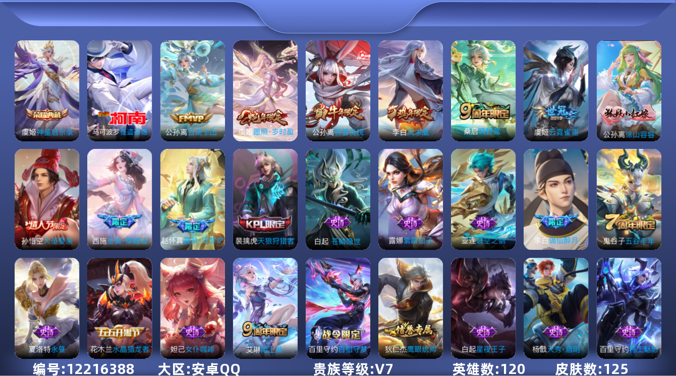 [12216388]【商品标题】:安卓Q-V2-永恒钻石IV段位-120英雄-125皮肤-1典藏-0珍品无双-0无双-1珍品传说-6传说-39史诗