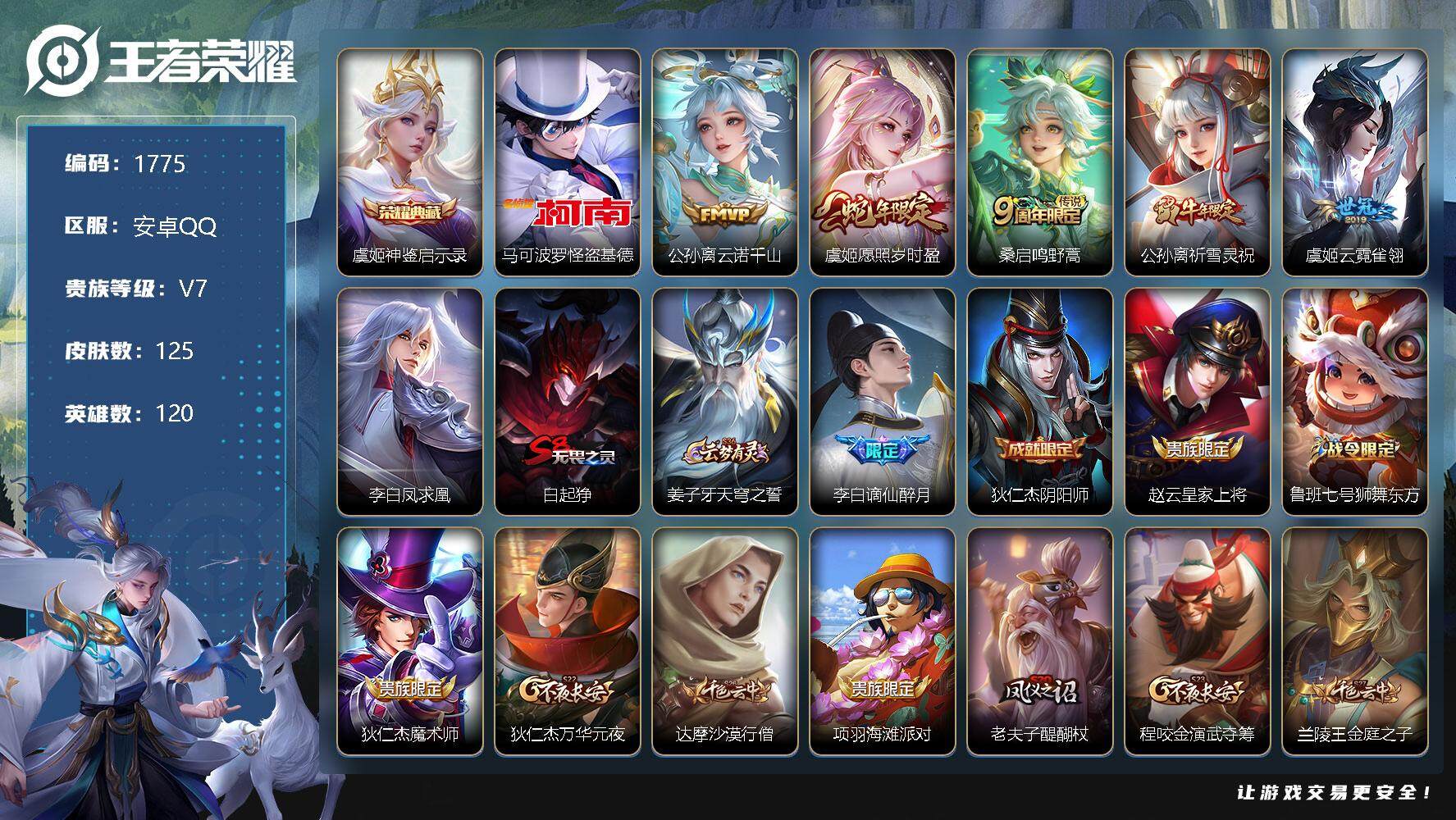 - [12264976]V7 2典藏 1珍品传说 7传说 124英雄 239皮肤 可修改实名 优质装备:天鹅之梦(小乔典藏),幻阙歌(貂蝉典藏),怪盗基德,黄金射手座,山海·炽霜斩(李信年限),浮生妄,涂山容容 传说皮:幻光神枪 珍宝阁皮:胡桃夹子,蔷薇恋人 限定皮:愿照·九州拓(澜年限),逐霄战戟,鸣野蒿,至尊宝,凤凰于飞,降魔,五谷丰年,梁祝,天狼绘梦者,纯白花嫁,深海之息(深海大菠萝) 史诗皮:鸭鸭历险记-刘禅,化蝶舞,星界战将,龙之律动,百相守梦-周瑜,茶境仙,蒙犽顽岩魄,百相守梦-百里守约,百相守梦-黄忠,紫霞仙子,电玩小子(小书包),特工魅影,千年之狐,永昼,江河有灵,蒙恬荣光圣徽,冰冠公主,偶像歌手,电玩·爆裂旋风,龙骑士(小龙虾),末日机甲-吕布,猫狗日记-孙策,时之恋人-孙尚香,乱世虎臣,修罗,女仆咖啡,摇滚巨星,水果甜心,星夜王子,心灵骇客,功夫厨神,德古拉伯爵,暗隐猎兽者,幽灵船长,鬼剑武藏,心灵战警,乐园奇幻夜,拒霜思,缤纷独角兽,乘风破浪,逐浪之夏,水晶猎龙者,曙光守护者,箭羽风息,金属风暴,圣诞恋歌,鹰眼统帅,魅力维加斯,黎明之约,无心,未来纪元-赵云