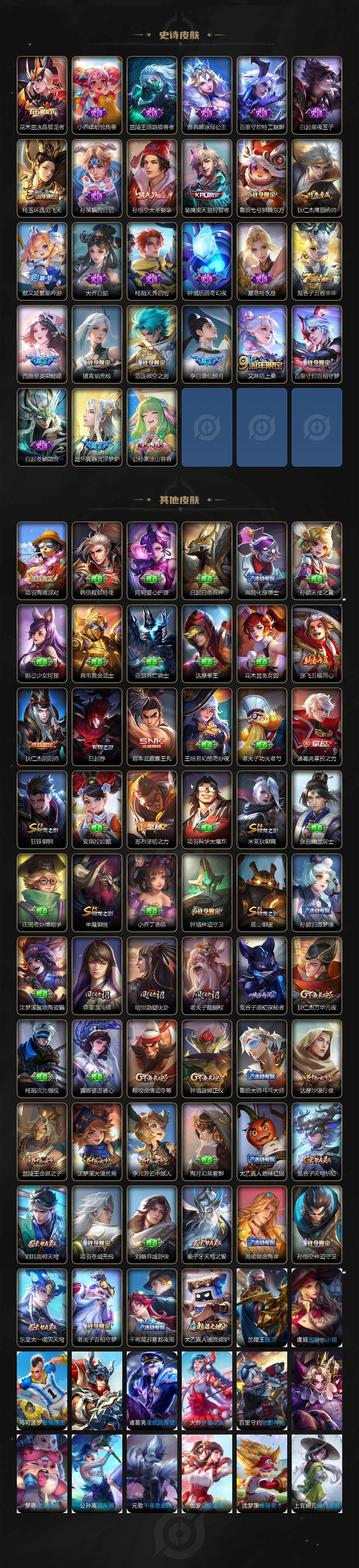 【史诗皮肤】:露娜紫霞仙子,赵云皇家上将,貂蝉圣诞恋歌,狄仁杰魔术师,廉颇地狱岩魂,宫本武藏鬼剑武藏,孙尚香水果甜心,嬴政暗夜贵公子,妲己魅力维加斯,妲己女仆咖啡,墨子金属风暴,韩信白龙吟,花木兰水晶猎龙者,小乔缤纷独角兽,兰陵王暗隐猎兽者,雅典娜冰冠公主,百里守约特工魅影,白起星夜王子,杨玉环遇见飞天,孙策猫狗日记,孙悟空大圣娶亲,裴擒虎天狼狩猎者,鲁班七号狮舞东方,狄仁杰鹰眼统帅,蔡文姬繁星吟游,大乔白蛇,杨戬天秀启明,钟馗乐园奇幻夜,夏洛特永昼,鬼谷子五谷丰年,西施至美乘鲤谣,镜青焰无极,亚连破空之剑,李白谪仙醉月,艾琳陌上桑,百里守约百相守梦,白起苍鳞隐世,赵怀真器灵浮梦炉,公孙离涂山容容