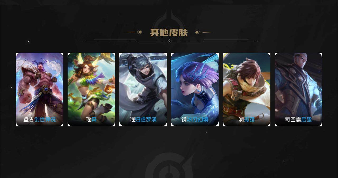 【限定皮肤】:白起狰,姜子牙天穹之誓,李白谪仙醉月,狄仁杰阴阳师,赵云皇家上将,鲁班七号狮舞东方,狄仁杰魔术师,狄仁杰万华元夜,达摩沙漠行僧,项羽海滩派对,老夫子醍醐杖,程咬金演武夺筹,兰陵王金庭之子,孙悟空大圣娶亲,牛魔御旌,李元芳云中旅人,钟馗神迹守卫,钟馗驱傩正仪,杨玉环遇见飞天,蔡文姬繁星吟游,鬼谷子原初探秘者,鬼谷子五谷丰年,弈星混沌棋,公孙离祈雪灵祝,沈梦溪大漠名商,明世隐疑决卦,裴擒虎天狼狩猎者,狂铁御狮,米莱狄御霄,盾山御銮,西施至美乘鲤谣,鬼谷子天穹祈灯,刘邦剑破天穹,镜青焰无极,项羽苍威无极,刘备异域游侠,周瑜熔金海岸