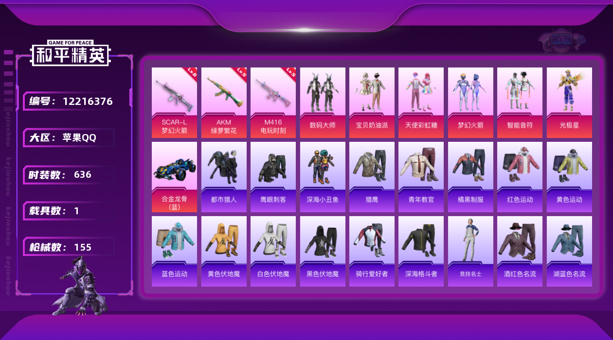 [12216376]6粉装 3特效枪 1载具 11印记 可二次 可修改实名 身法装备:都市猎人,暗影哥特(红眼罩),萌熊伴侣背包(粉熊背包) 优质装备:合金龙骨(蓝),都市猎人,萌熊伴侣背包(粉熊背包),SCAR-L梦幻火箭,梦幻火箭(新101)(新火箭少女101粉色套装),数码大师,宝贝奶油派,天使彩虹糖,智能音符,AKM绿萝繁花,M416电玩时刻 热门装扮:光极星,鹰眼刺客,深海小丑鱼,都市猎人 六级特效枪:六级SCAR-L-梦幻火箭 五级特效枪:五级M416-电玩时刻,五级AKM-绿萝繁花 紫色装扮:田园牧歌,轻风白浪,和煦暖阳,SS22特训,SS23特训,幻彩翩翩,妙红点点,娇憨猪猪,萌趣咩咩,SS21特训,SS2特训,SS3特训,SS4特训,SS5特训,人气偶像,冰川特警,冷焰舞者,青涩时光,SS20特训,青春冒险家,潮流游乐家,SS15特训,暗夜傀儡,迪迦奥特曼,SS16特训,冰爽海盐,治愈之星,科技之星,SS14特训,萌趣颜团子,飞驰魅影,音速流光,SS19特训,吉莉礼服,甜心亚梦,虚音幻奏,瑞龙福将,团圆交子,SS17特训,异彩先驱,SS18特训,都市魅力,酒红色名流,酷潮明星,野性战心,长空猛禽,雨林探路者,雪山精英,霓虹极客,霓虹街区,青年教官,青春校园,迎春赐吉,风暴特警,缤纷果语,耀眼新星,蓝彩潮人,蓝色守护者,蓝色运动,街头潮人,西部风情,超能勇士,青涩年华,骑行爱好者,魅力单车,鹤鸣,黄色伏地魔,黄色名流,黄色运动,黑色伏地魔,龙的传人,沙漠毒蛇,朋克治安官,极地朋克,极速红龙,柠萌假日,橘黑制服,沙漠兵团,沙漠探路者,海岛探路者,深海格斗者,深蓝色名流,清新柠檬,滨海假日,幻影武者,坚韧舞者,夏日倾情,夏日音浪,夜莺强袭者,完美偶像,帅气教官,幻世战舞者,怒火燎原,战地督导,战地菁英,探宝勇士,湖蓝色名流,滨海厨神,绮丽涂鸦,疯狂小兔子,白熊同盟,白色伏地魔,破晓战魂,破蛋小黄鸡,神秘领域,福星高照,突袭者,竞技达人朋克,红色运动,王牌教练,牛气冲天,灼焰舞者,炫蓝之夏,热血青春,燃烧卡路里,牛气满满,猛禽,特战英豪,狂战萌兔,猎鹰,纯真浪花,热情海星,SS28特训,卖崽青蛙,暗影刺翼,玉兔迎春,竞技名士,暗影哥特(红眼罩),果汁能量,惊鸿侠骨,SS25特训,锦衣飞扬,超人强,焰鹰斗篷,幻羽潜行,幽夜迷踪,SS27特训,Alan Walker,浪漫天命
