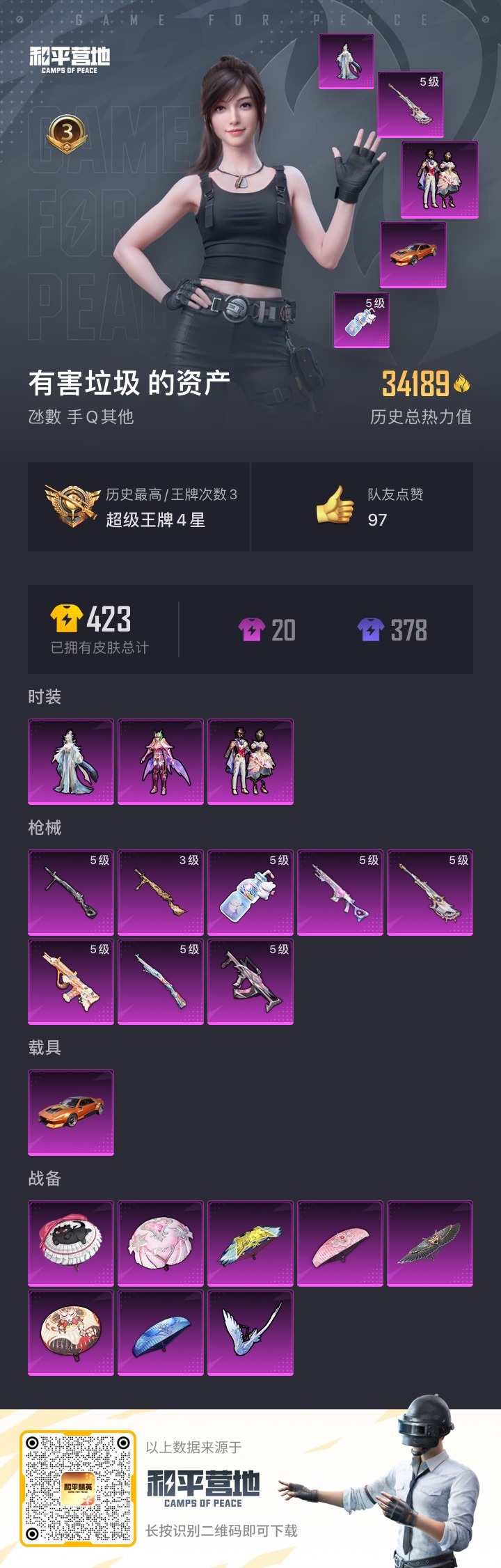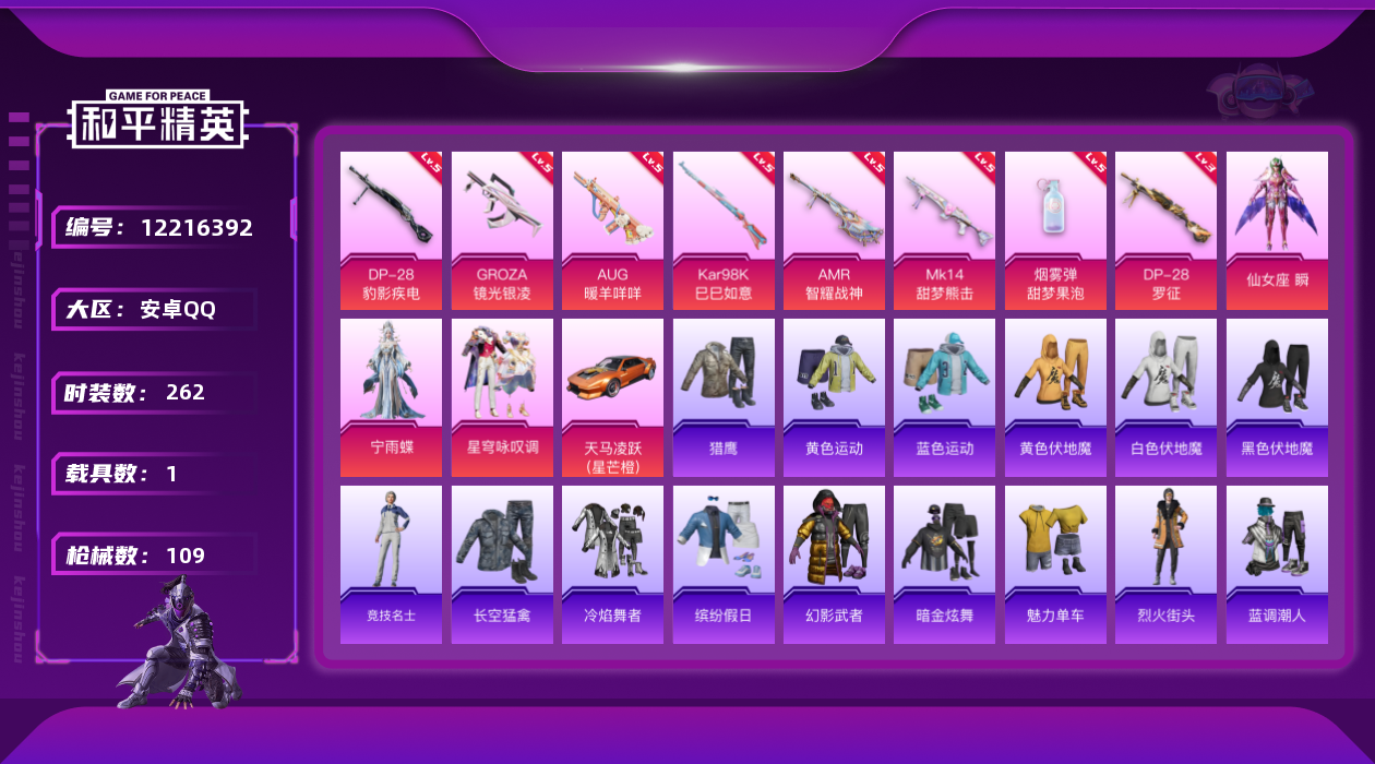 - PX_2101382-??/枪械31/装备472/载具7/战备225/王牌印记16/热力值140923/五级AKM-梦之光华/一级AKM-星际浪客/一级SCAR-L-梦幻火箭/四级SCAR-L-锦绣绵绵/三级SCAR-L-金蛇镇世/一级M416-风花雪月/七级M416-至情至圣/五级M416-电玩时刻/二级M416-墨龙九天/一级GROZA-焦糖拿铁/三级GROZA-精灵之光/五级AUG-星之彼岸