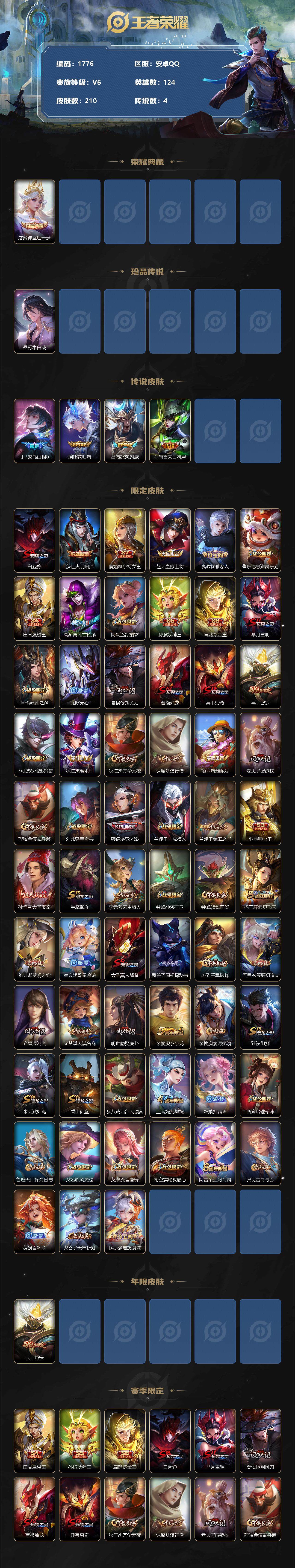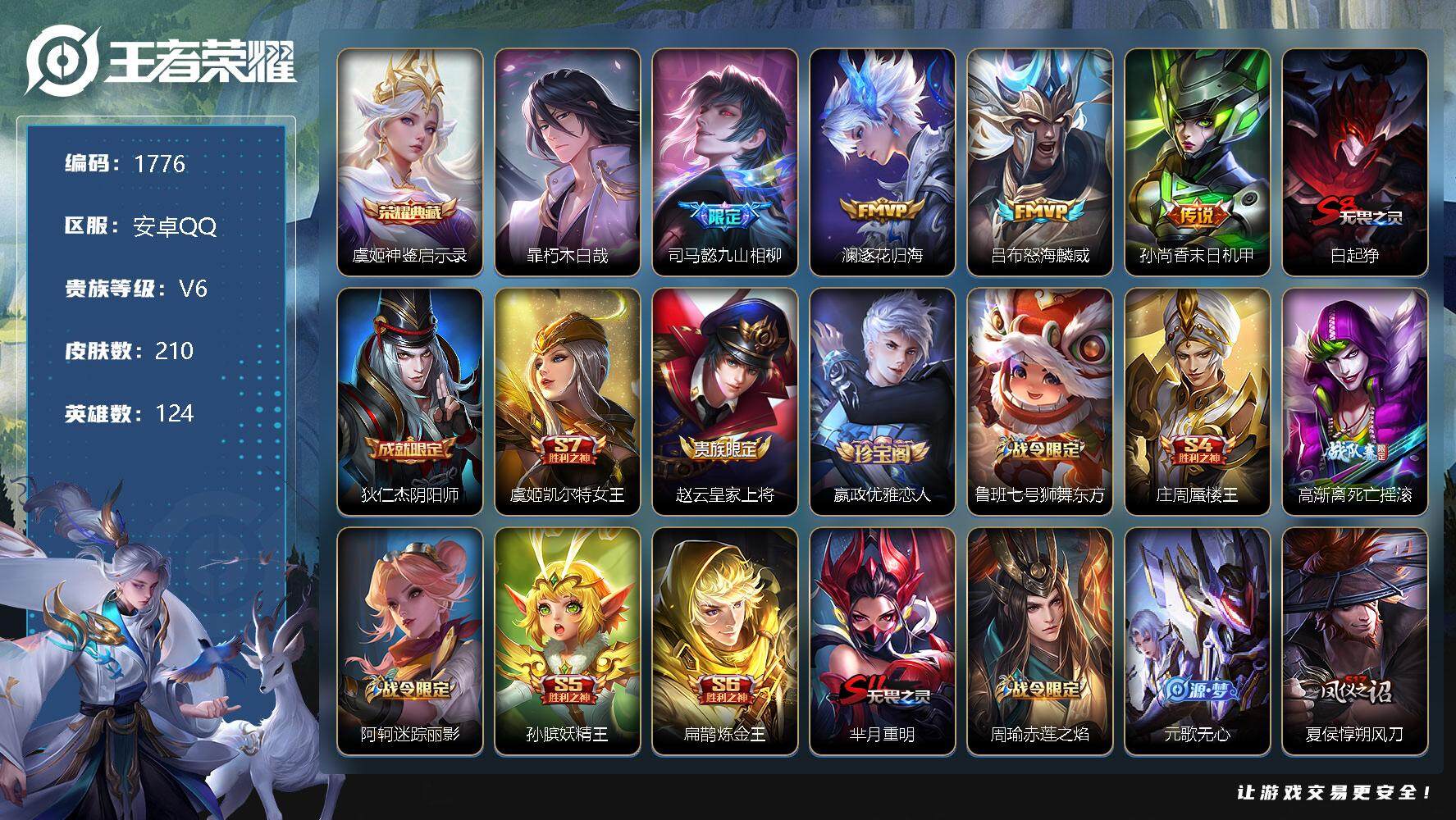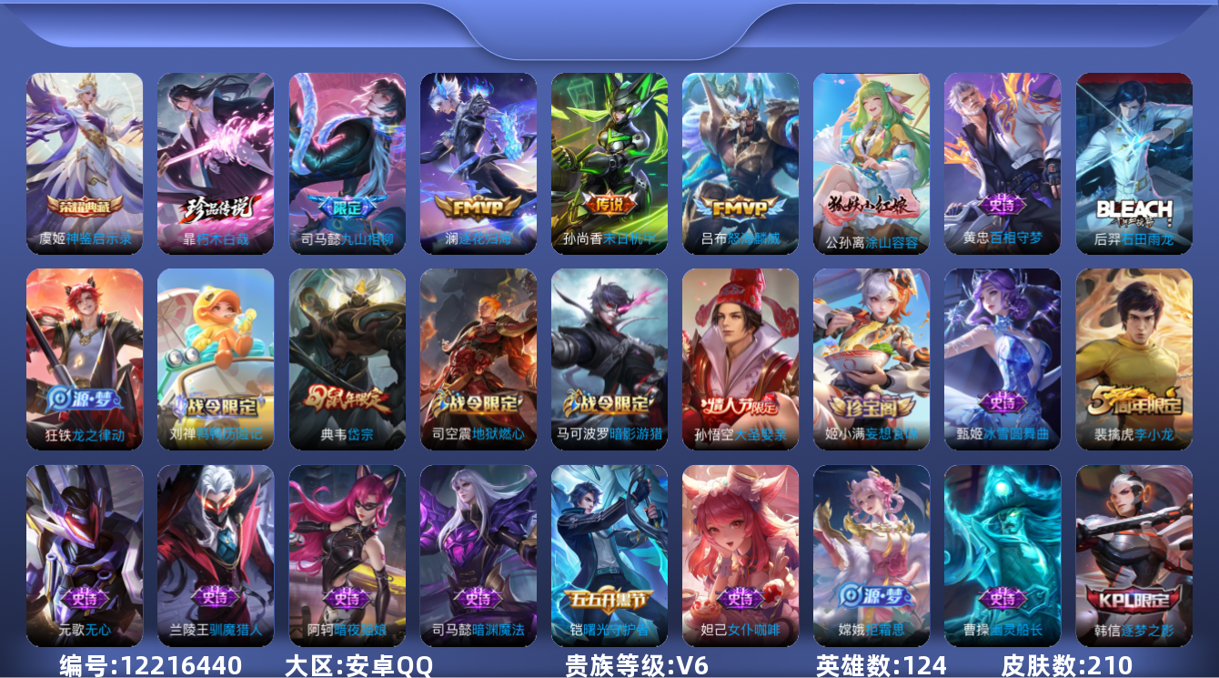 [12216440]【商品标题】:安卓Q-V6-至尊星耀III段位-124英雄-210皮肤-1典藏-0珍品无双-0无双-1珍品传说-4传说-52史诗