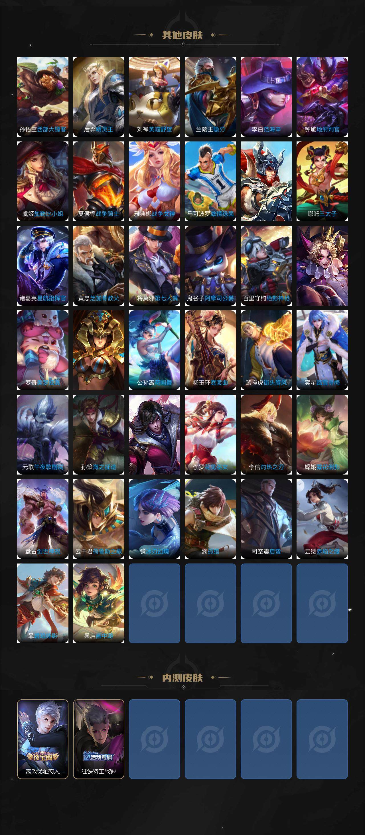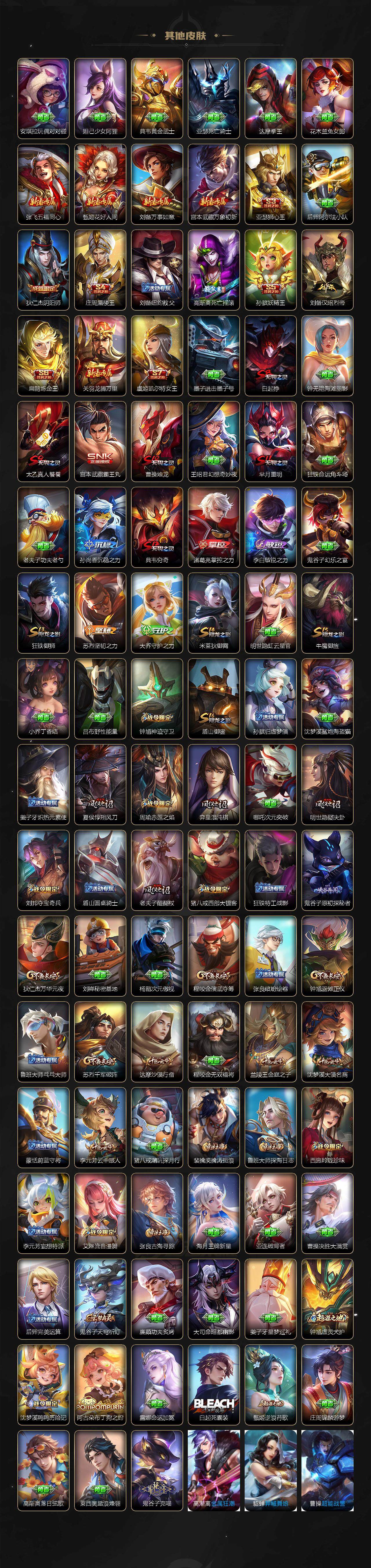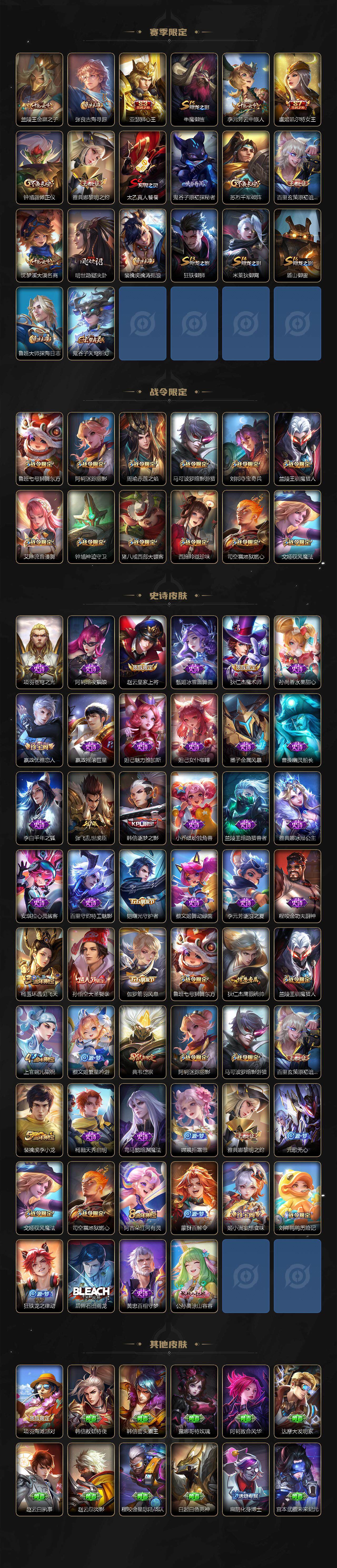 【限定皮肤】:白起狰,狄仁杰阴阳师,虞姬凯尔特女王,赵云皇家上将,嬴政优雅恋人,鲁班七号狮舞东方,庄周蜃楼王,高渐离死亡摇滚,阿轲迷踪丽影,孙膑妖精王,扁鹊炼金王,芈月重明,周瑜赤莲之焰,元歌无心,夏侯惇朔风刀,曹操烛龙,典韦穷奇,典韦岱宗,马可波罗暗影游猎,狄仁杰魔术师,狄仁杰万华元夜,达摩沙漠行僧,项羽海滩派对,老夫子醍醐杖,程咬金演武夺筹,刘邦夺宝奇兵,韩信逐梦之影,兰陵王驯魔猎人,兰陵王金庭之子,亚瑟狮心王,孙悟空大圣娶亲,牛魔御旌,李元芳云中旅人,钟馗神迹守卫,钟馗驱傩正仪,杨玉环遇见飞天,雅典娜黎明之约,蔡文姬繁星吟游,太乙真人饕餮,鬼谷子原初探秘者,苏烈千军破阵,百里玄策原初追逐者,弈星混沌棋,沈梦溪大漠名商,明世隐疑决卦,裴擒虎李小龙,裴擒虎擒涛扼浪,狂铁御狮,米莱狄御霄,盾山御銮,猪八戒西部大镖客,上官婉儿梁祝,嫦娥拒霜思,西施玲珑珍味,鲁班大师探海日志,戈娅驭风魔法,艾琳流音漫舞,司空震地狱燃心,阿古朵江河有灵,张良古海寻踪,蒙犽百解令,鬼谷子天穹祈灯,姬小满妄想食味
