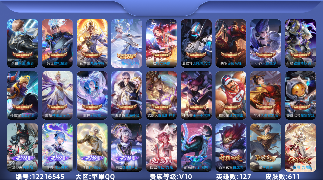[12216545]【商品标题】:苹果Q-V10-永恒钻石II段位-127英雄-611皮肤-18典藏-0珍品无双-5无双-0珍品传说-108传说-213史诗