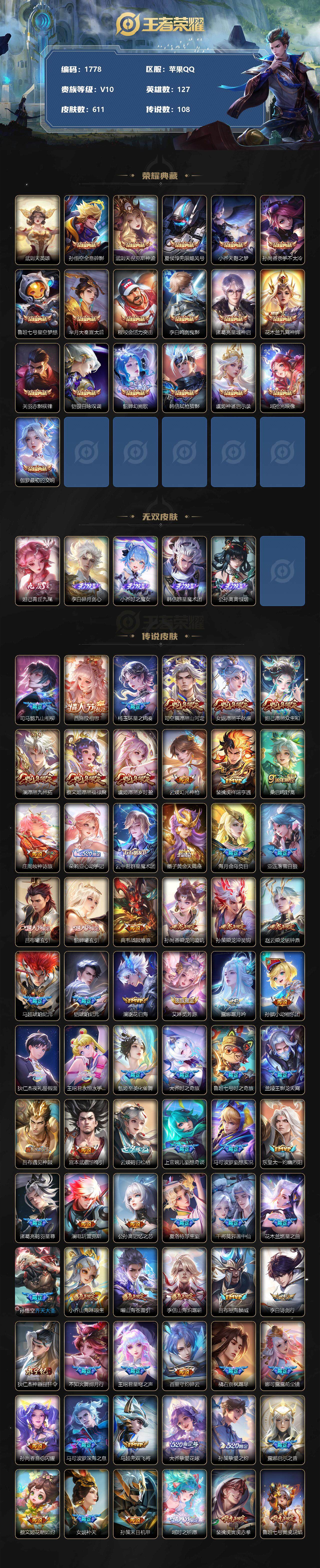 [12216545]【商品标题】:苹果Q-V10-永恒钻石II段位-127英雄-611皮肤-18典藏-0珍品无双-5无双-0珍品传说-108传说-213史诗 【荣耀典藏】:武则天英雄,孙悟空全息碎影,武则天倪克斯神谕,夏侯惇无限飓风号,小乔天鹅之梦,孙尚香杀手不太冷,鲁班七号星空梦想,芈月大秦宣太后,程咬金活力突击,李白鸣剑曳影,诸葛亮星域神启,花木兰九霄神辉,关羽赤影疾锋,铠银白咏叹调,貂蝉幻阙歌,韩信弑枪猎影,虞姬神鉴启示录,瑶拾光映像,伽罗最初的交响 【无双皮肤】:妲己青丘九尾,李白碎月剑心,小乔时之魔女,韩信群星魔术团,公孙离离恨烟 【传说皮肤】:司马懿九山相柳,西施续相思,杨玉环星之鸣奏,司空震愿照山河定,女娲愿照千秋盛,妲己愿照众生和,澜愿照九州拓,蔡文姬愿照福禄聚,虞姬愿照岁时盈,云缨幻光神枪,裴擒虎祥瑞亨通,桑启鸣野蒿,庄周牧神诗旅,朵莉亚心动手记,云中君群星魔术团,墨子黄金天蝎座,海月金乌负日,亚连落雪白狼,吕布曦玄引,貂蝉曦玄引,典韦战鼓燎原,孙尚香乘龙问璇玑,孙策乘龙淬吴钩,赵云乘龙铭钟鼎,马超琥珀纪元,铠琥珀纪元,澜逐花归海,艾琳觅芳踪,露娜霜月吟,孙膑小动物乐团,狄仁杰夜礼服假面,王昭君永恒水手月亮,甄姬至美化雀舞,大乔时之奇旅,鲁班七号时之奇旅,兰陵王影龙天霄,吕布遇见神鼓,宫本武藏惊梅引,云缨鹤归松栖,上官婉儿妄想奇谈,马可波罗妄想实况,东皇太一灼幽烈阳,诸葛亮鹤羽星尊,澜电玩雷克斯,公孙离记忆之芯,夏洛特浮生妄,干将莫邪画中仙,花木兰燃星之曲,孙悟空齐天大圣,小乔山海琳琅生,曜山海苍雷引,李信山海炽霜斩,吕布怒海麟威,李白诗剑行,狄仁杰神器狴犴令,不知火舞绯月行,王昭君星穹之声,百里守约碎云,橘右京枫霜尽,娜可露露前尘镜,孙尚香音你闪耀,马可波罗深海之息,马超无双飞将,大乔挚爱花嫁,孙策挚爱之约,露娜启示之音,蔡文姬花朝如约,女娲补天,孙策末日机甲,瑶时之祈愿,裴擒虎寅虎赤拳,鲁班七号寅虎瑞焰,赵云淬星耀世,王昭君乞巧织情,西施游龙清影,曜李逍遥 ,周瑜音你心动,小乔音你心动,李元芳飞鸢探春,公孙离祈雪灵祝,诸葛亮时雨天司,铠绛天战甲,镜炽阳神光,虞姬启明星使,孙悟空零号赤焰,关羽武圣,曜云鹰飞将,李信一念神魔,刘备时之恋人,伽罗太华,貂蝉猫影幻舞,张良黄金白羊座,干将莫邪久胜战神,虞姬云霓雀翎,达摩黄金狮子座,百里玄策白虎志,花木兰冠军飞将,梦奇胖达