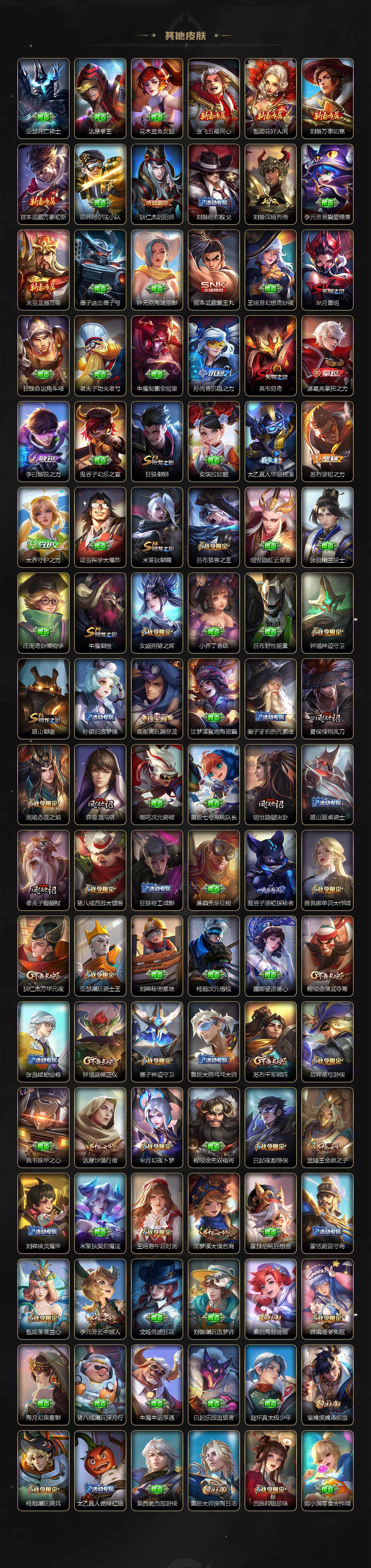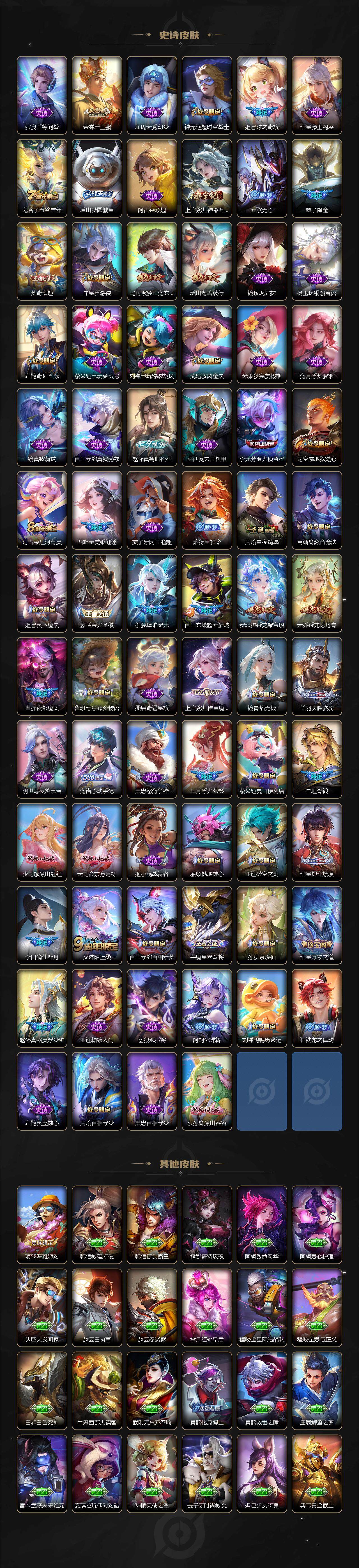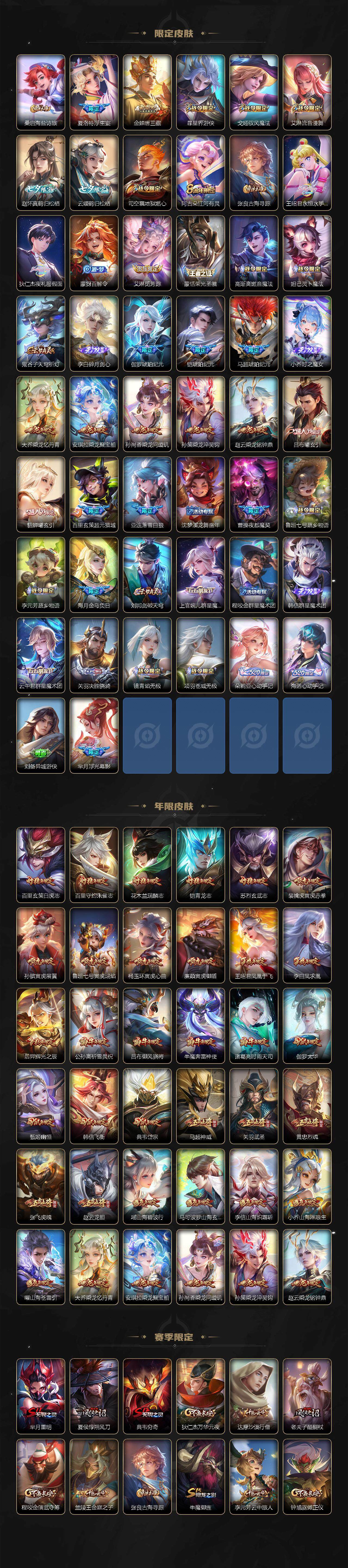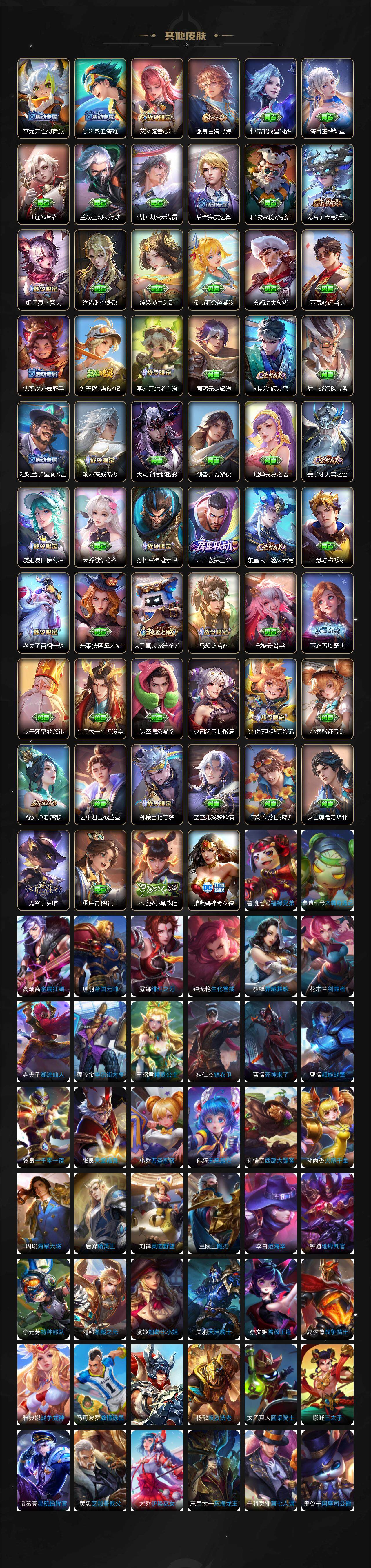 裴擒虎李小龙,上官婉儿梁祝,牛魔奔雷神使,貂蝉逐梦之音,公孙离祈雪灵祝,吕布御风骁将,诸葛亮时雨天司,赵云龙胆,关羽武圣,黄忠烈魂,张飞虎魄,马超神威,后羿辉光之辰,典韦岱宗,甄姬幽恒,韩信飞衡,伽罗太华,曹操天狼征服者,裴擒虎天狼狩猎者,上官婉儿天狼绘梦者,马可波罗逐梦之星,韩信逐梦之影,铠青龙志,百里玄策白虎志,花木兰瑞麟志,苏烈玄武志,百里守约朱雀志,王昭君凤凰于飞,孙悟空大圣娶亲,露娜一生所爱,后羿如梦令,嫦娥如梦令,孙悟空至尊宝,雅典娜神奇女侠,妲己热情桑巴,干将莫邪冰霜恋舞曲,公孙离蜜橘之夏,芈月白晶晶,安琪拉魔法小厨娘,庄周云端筑梦师,鲁班七号乒乒小将,大乔白鹤梁神女,猪八戒猪悟能,廉颇寅虎·御盾,老夫子圣诞老人,孙悟空孙行者,甄姬女儿国国王,韩信傲雪梅枪,鲁班七号寅虎·瑞焰,孙膑寅虎·展翼,杨玉环寅虎·心曲,裴擒虎寅虎·赤拳,云中君时之祈愿,瑶时之祈愿,女娲补天,公孙离玉兔公主,露娜启示之音,夏侯惇匿光决锋者,马可波罗深海之息,金蝉唐三藏,娜可露露前尘镜,橘右京枫霜尽,妲己时之奇旅,王昭君星穹之声,不知火舞绯月行,上官婉儿神器·万象笔,盾山梦圆繁星,墨子降魔,李白诗剑行,马可波罗山海·玄木吟,瑶山海·碧波行,兰陵王影龙天霄,西施至美·乘鲤谣,甄姬至美·化雀舞,桑启鸣野蒿,艾琳陌上桑,澜愿照·九州拓,蔡文姬愿照·福禄聚,虞姬愿照·岁时盈,司空震愿照·山河定,妲己愿照·众生和,女娲愿照·千秋盛