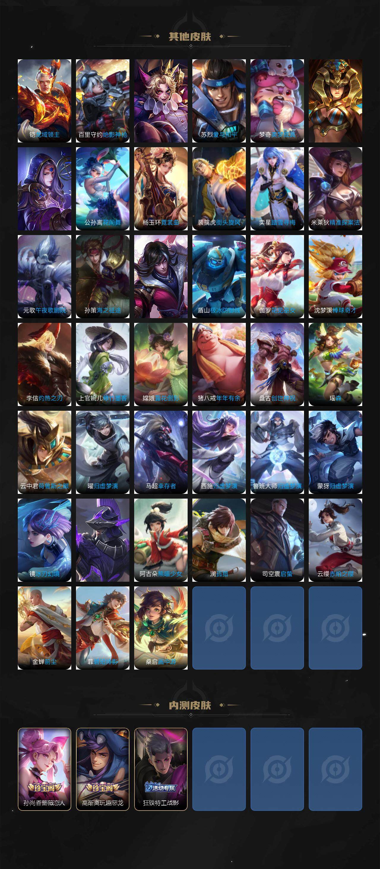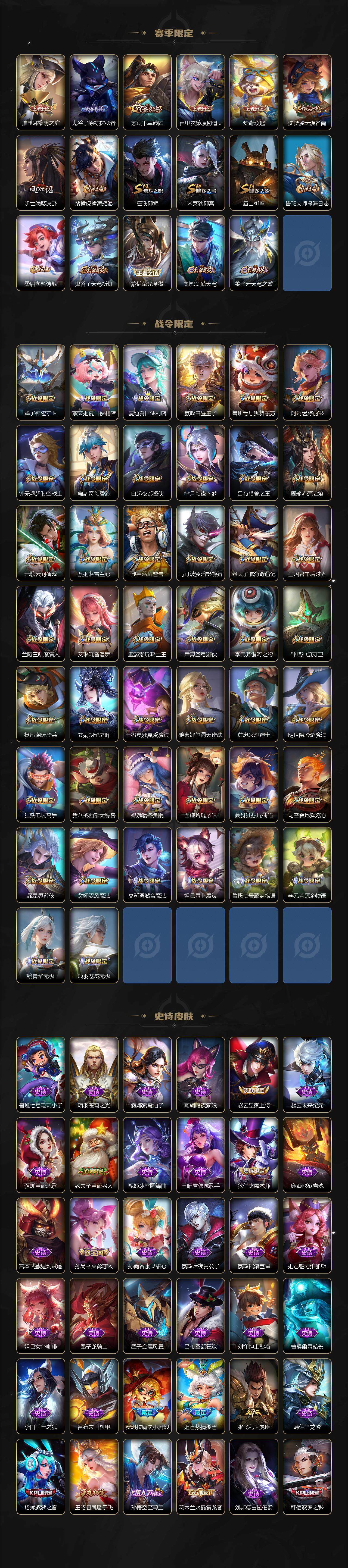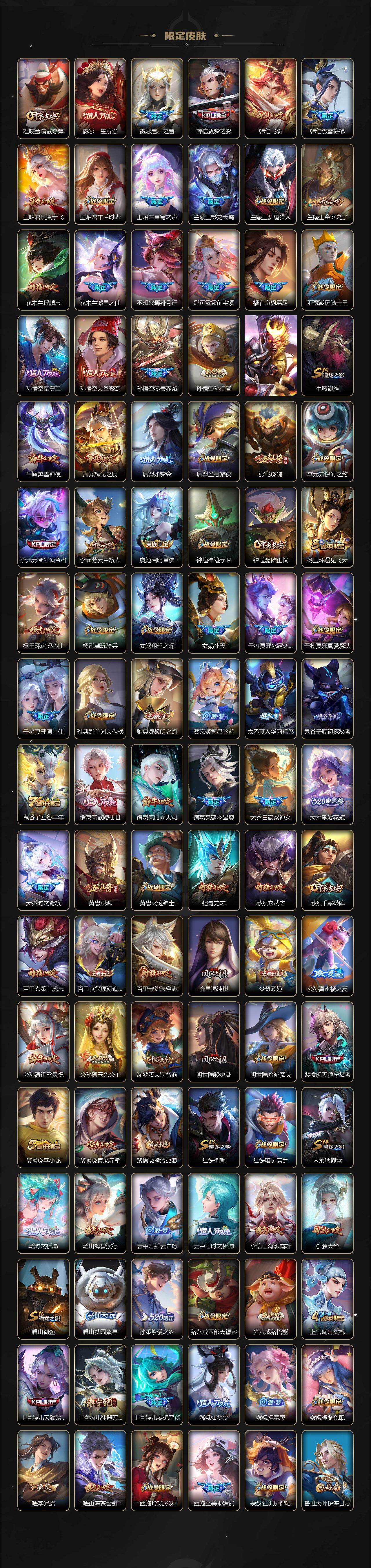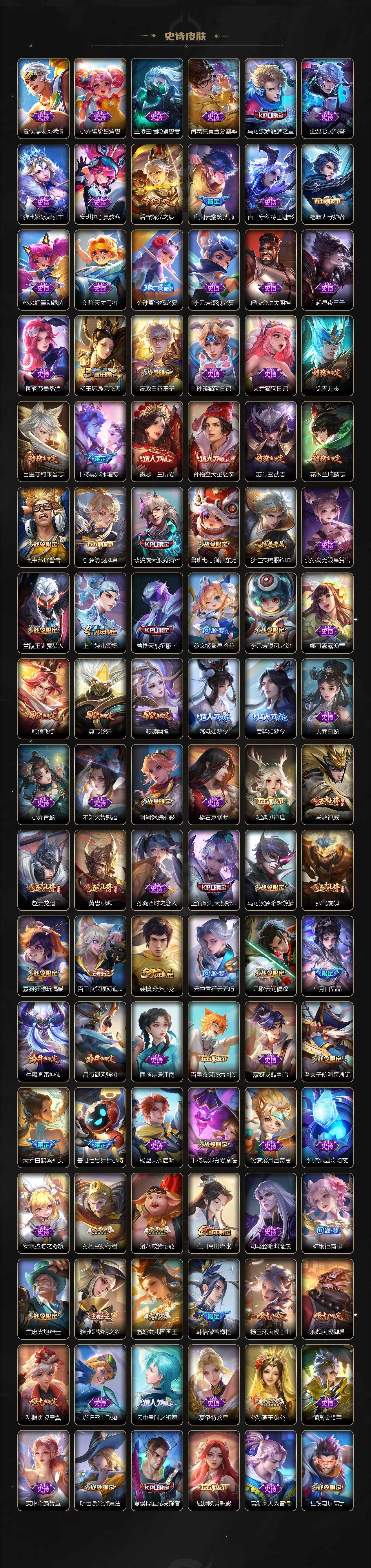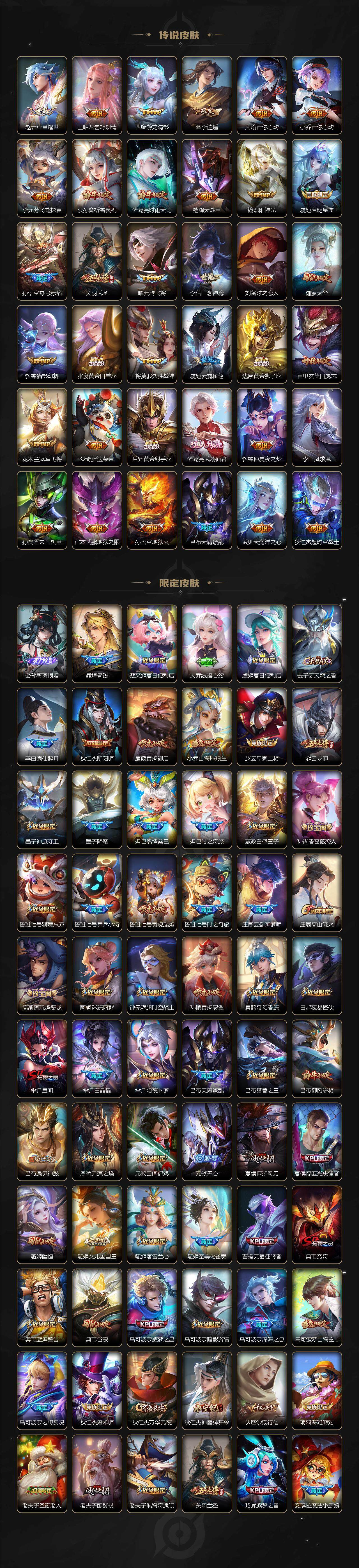 裴擒虎李小龙,上官婉儿梁祝,牛魔奔雷神使,貂蝉逐梦之音,公孙离祈雪灵祝,吕布御风骁将,诸葛亮时雨天司,赵云龙胆,关羽武圣,黄忠烈魂,张飞虎魄,马超神威,后羿辉光之辰,典韦岱宗,甄姬幽恒,韩信飞衡,伽罗太华,曹操天狼征服者,裴擒虎天狼狩猎者,上官婉儿天狼绘梦者,马可波罗逐梦之星,韩信逐梦之影,铠青龙志,百里玄策白虎志,花木兰瑞麟志,苏烈玄武志,百里守约朱雀志,王昭君凤凰于飞,孙悟空大圣娶亲,露娜一生所爱,后羿如梦令,嫦娥如梦令,孙悟空至尊宝,雅典娜神奇女侠,妲己热情桑巴,干将莫邪冰霜恋舞曲,公孙离蜜橘之夏,芈月白晶晶,安琪拉魔法小厨娘,庄周云端筑梦师,鲁班七号乒乒小将,大乔白鹤梁神女,猪八戒猪悟能,廉颇寅虎·御盾,老夫子圣诞老人,孙悟空孙行者,甄姬女儿国国王,韩信傲雪梅枪,鲁班七号寅虎·瑞焰,孙膑寅虎·展翼,杨玉环寅虎·心曲,裴擒虎寅虎·赤拳,云中君时之祈愿,瑶时之祈愿,女娲补天,公孙离玉兔公主,露娜启示之音,夏侯惇匿光决锋者,马可波罗深海之息,金蝉唐三藏,娜可露露前尘镜,橘右京枫霜尽,妲己时之奇旅,王昭君星穹之声,不知火舞绯月行,上官婉儿神器·万象笔,盾山梦圆繁星,墨子降魔,李白诗剑行,马可波罗山海·玄木吟,瑶山海·碧波行,兰陵王影龙天霄,西施至美·乘鲤谣,甄姬至美·化雀舞,桑启鸣野蒿,艾琳陌上桑,澜愿照·九州拓,蔡文姬愿照·福禄聚,虞姬愿照·岁时盈,司空震愿照·山河定,妲己愿照·众生和,女娲愿照·千秋盛