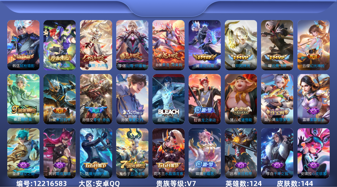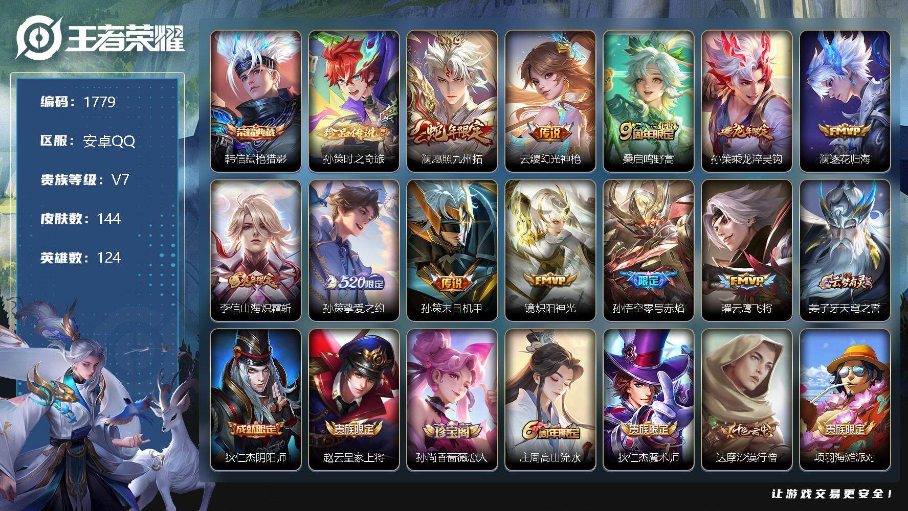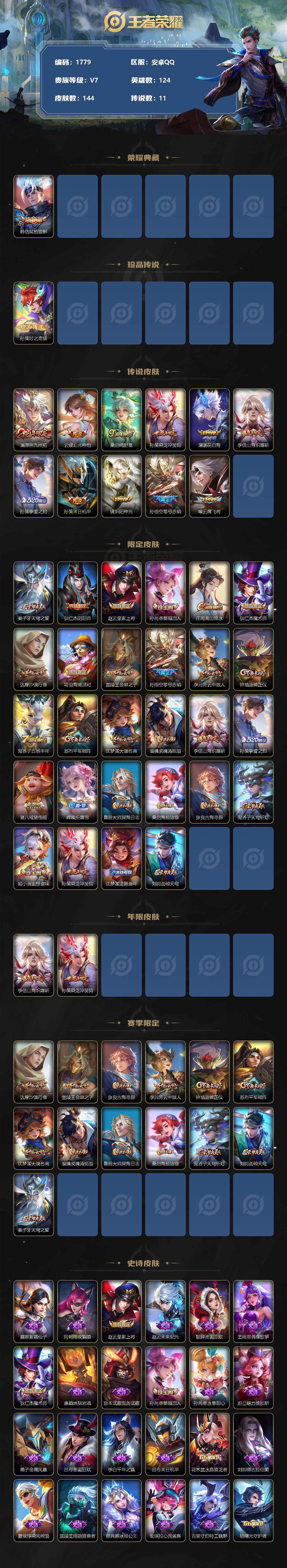 - [12148322]V7 1典藏 1无双 1珍品传说 5传说 125英雄 240皮肤 可修改实名 优质装备:弑枪猎影(韩信典藏),器灵·螭龙剑,云鹰飞将(小将军),久胜战神 珍品传说:时之奇旅-孙策 传说皮:乘龙·淬吴钩(孙策年限) 珍宝阁皮:万物之道,蔷薇恋人 限定皮:愿照·九州拓(澜年限),逐霄战戟,鸣野蒿,五谷丰年,梁祝,李小龙 史诗皮:赞萌露比,鸭鸭历险记-刘禅,器灵·浮梦炉,化蝶舞,谪仙醉月,龙之律动,石田雨龙,怒海争锋,琥珀纪元伽罗,蔬乡物语(鲁班七号),百相守梦-黄忠,电玩小子(小书包),黄金分割率,特工魅影,千年之狐,江河有灵,百解令(蒙犽),蒙恬荣光圣徽,电玩·爆裂旋风,龙骑士(小龙虾),末日机甲-吕布,猫狗日记-孙策,乱世虎臣,节奏热浪,摇滚巨星,水果甜心,天才门将,星夜王子,德古拉伯爵,暗隐猎兽者,幽灵船长,鬼剑武藏,心灵战警,乐园奇幻夜,舞动绿茵,地狱岩魂,纤云弄巧,拒霜思,乘风破浪,逐浪之夏,月团寄思,水晶猎龙者,金属风暴,原初追逐者,圣诞狂欢,圣诞恋歌,鹰眼统帅,暗夜贵公子,魅力维加斯,赏金猎手,无心