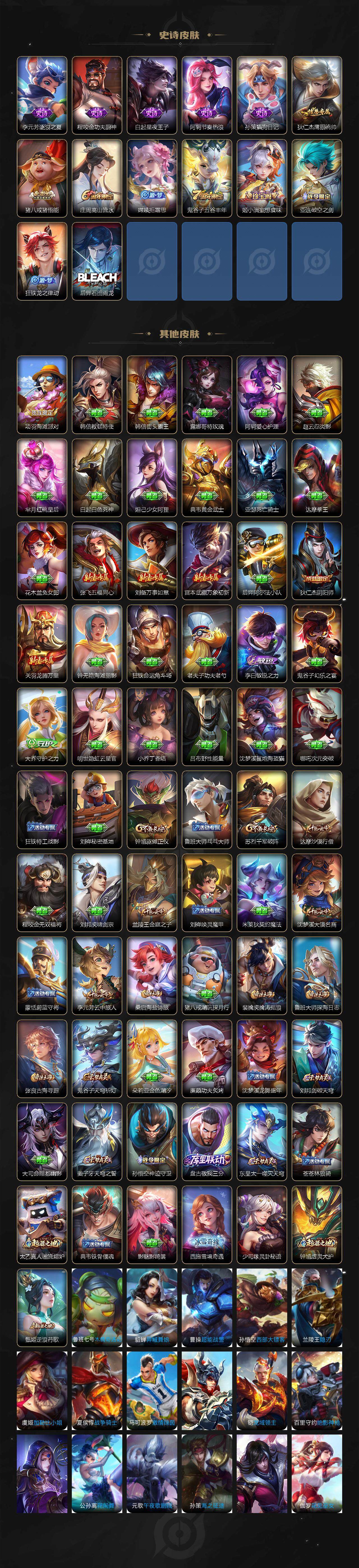 【史诗皮肤】:露娜紫霞仙子,阿轲暗夜猫娘,赵云皇家上将,赵云未来纪元,貂蝉圣诞恋歌,王昭君偶像歌手,狄仁杰魔术师,廉颇地狱岩魂,宫本武藏鬼剑武藏,孙尚香蔷薇恋人,孙尚香水果甜心,妲己魅力维加斯,墨子金属风暴,吕布圣诞狂欢,李白千年之狐,吕布末日机甲,花木兰水晶猎龙者,刘邦德古拉伯爵,夏侯惇乘风破浪,兰陵王暗隐猎兽者,雅典娜冰冠公主,安琪拉心灵骇客,百里守约特工魅影,铠曙光守护者,李元芳逐浪之夏,程咬金功夫厨神,白起星夜王子,阿轲节奏热浪,孙策猫狗日记,狄仁杰鹰眼统帅,猪八戒猪悟能,庄周高山流水,嫦娥拒霜思,鬼谷子五谷丰年,姬小满妄想食味,亚连破空之剑,狂铁龙之律动,后羿石田雨龙