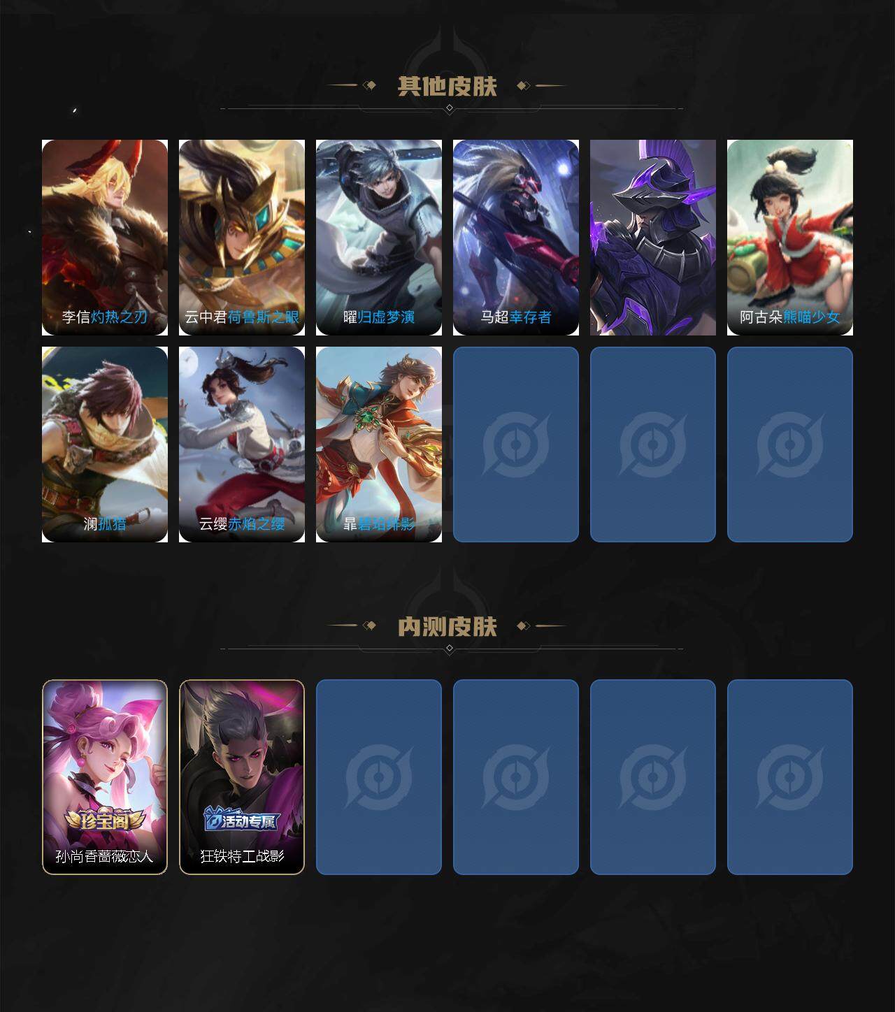 【其他皮肤】:项羽海滩派对,韩信教廷特使,韩信街头霸王,露娜哥特玫瑰,阿轲爱心护理,赵云忍炎影,芈月红桃皇后,白起白色死神,妲己少女阿狸,典韦黄金武士,亚瑟死亡骑士,达摩拳王,花木兰兔女郎,张飞五福同心,刘备万事如意,宫本武藏万象初新,后羿阿尔法小队,狄仁杰阴阳师,关羽龙腾万里,钟无艳海滩丽影,狂铁命运角斗场,老夫子功夫老勺,李白敏锐之力,鬼谷子幻乐之宴,大乔守护之力
