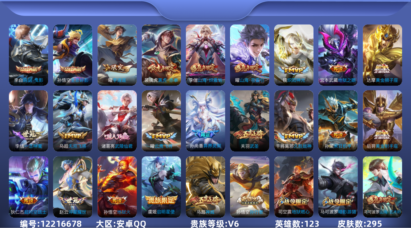 [12216678]【商品标题】:安卓Q-V6-荣耀黄金I段位-123英雄-295皮肤-2典藏-0珍品无双-0无双-0珍品传说-20传说-92史诗