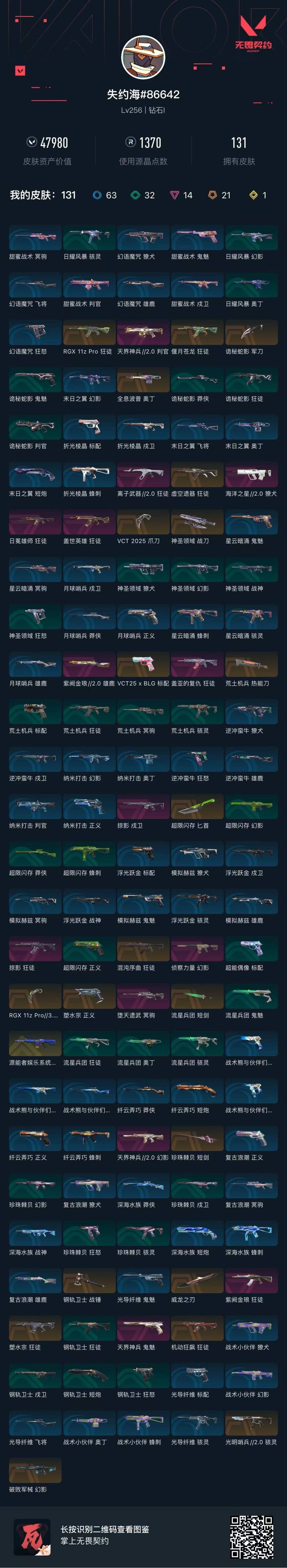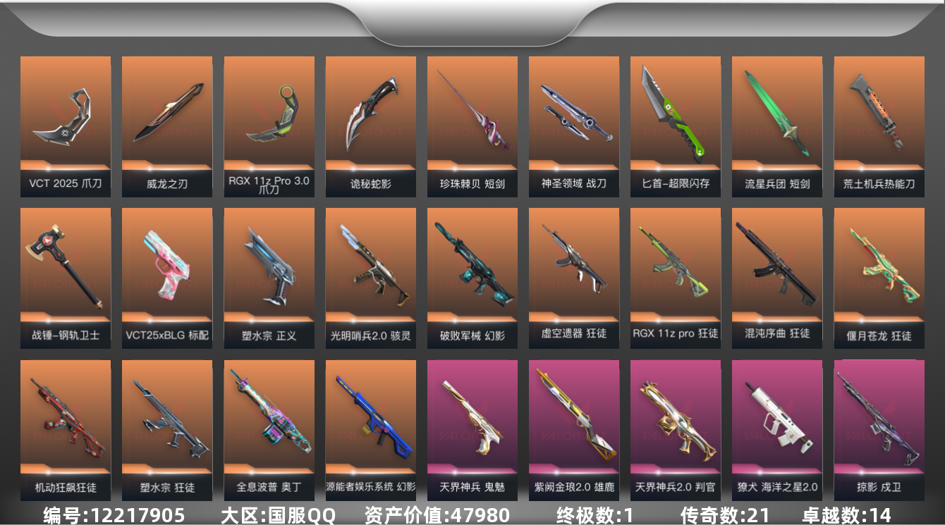 [12217905]21橙皮 1金皮 14紫皮 131皮肤 27英雄 203卡面 1370已用源晶 钻石 优质装备:狂徒-塑水宗,幻影-源能者娱乐系统,狂徒-混沌序曲,狂徒-掠影,狂徒-紫阙金琅,狂徒-盖亚的复仇,狂徒-偃月苍龙,幻影-侦察力量,狂徒-机动狂飙,幻影-破败军械,正义-塑水宗,冥驹-堕天遗武,幻影-天界神兵2.0,狂徒-日冕雄师,戍卫-掠影,鬼魅-天界神兵,狂徒-盖世英雄,骇灵-光明哨兵2.0,奥丁-全息波普,威龙之刃,爪刀-RGX 11z Pro 3.0,匕首-超限闪存,荒土机兵热能刀,神圣领域 战刀,VCT 2025 爪刀,诡秘蛇影,雄鹿-紫阙金琅2.0,判官-天界神兵2.0 套装:VCT 2025赛季礼包,VCTCN2025套装 佩枪皮肤:标配-VCT25xBLG 步枪皮肤:獠犬-海洋之星2.0,狂徒-虚空遗器,RGX 11z pro 狂徒,狂徒-离子武器2.0 近战武器皮肤:战锤-钢轨卫士,短剑-流星兵团,短剑-珍珠棘贝