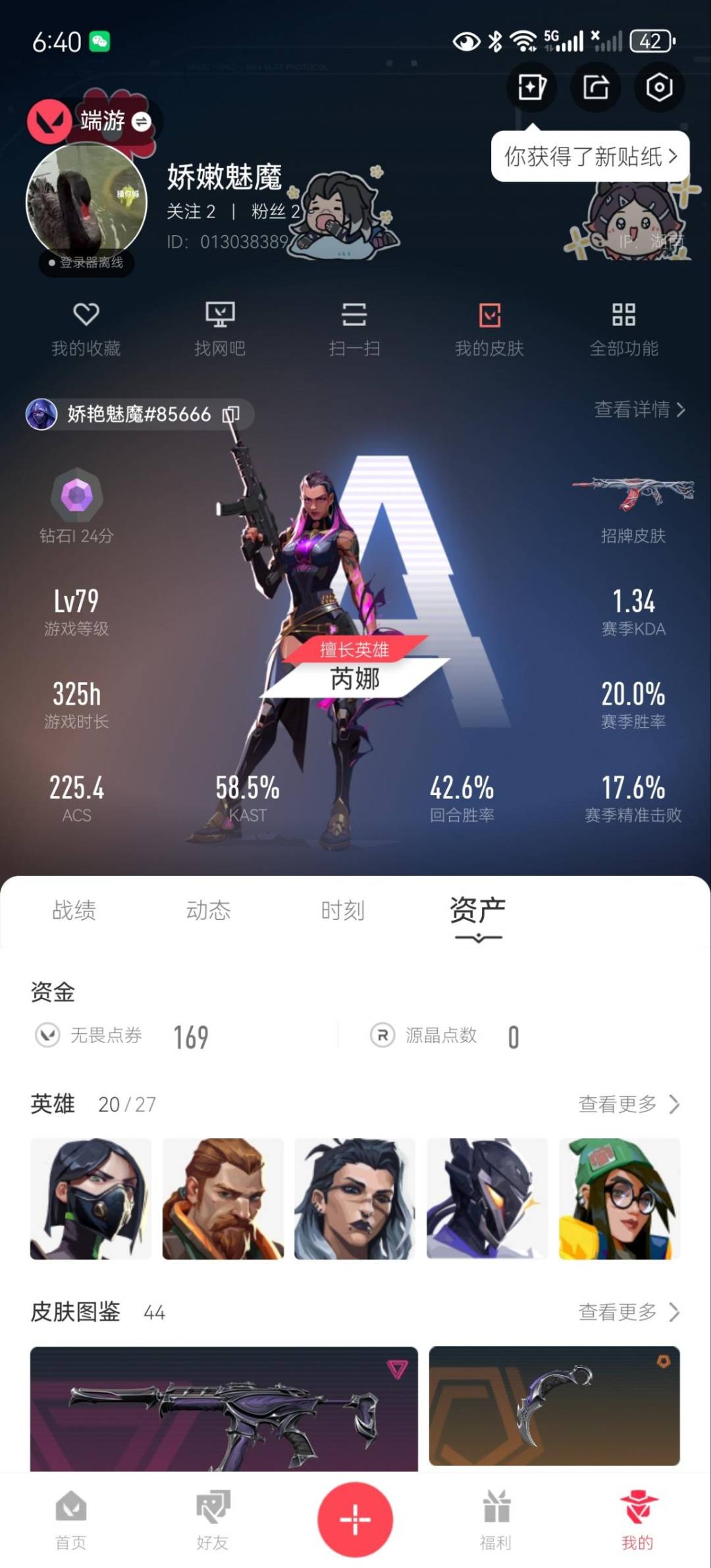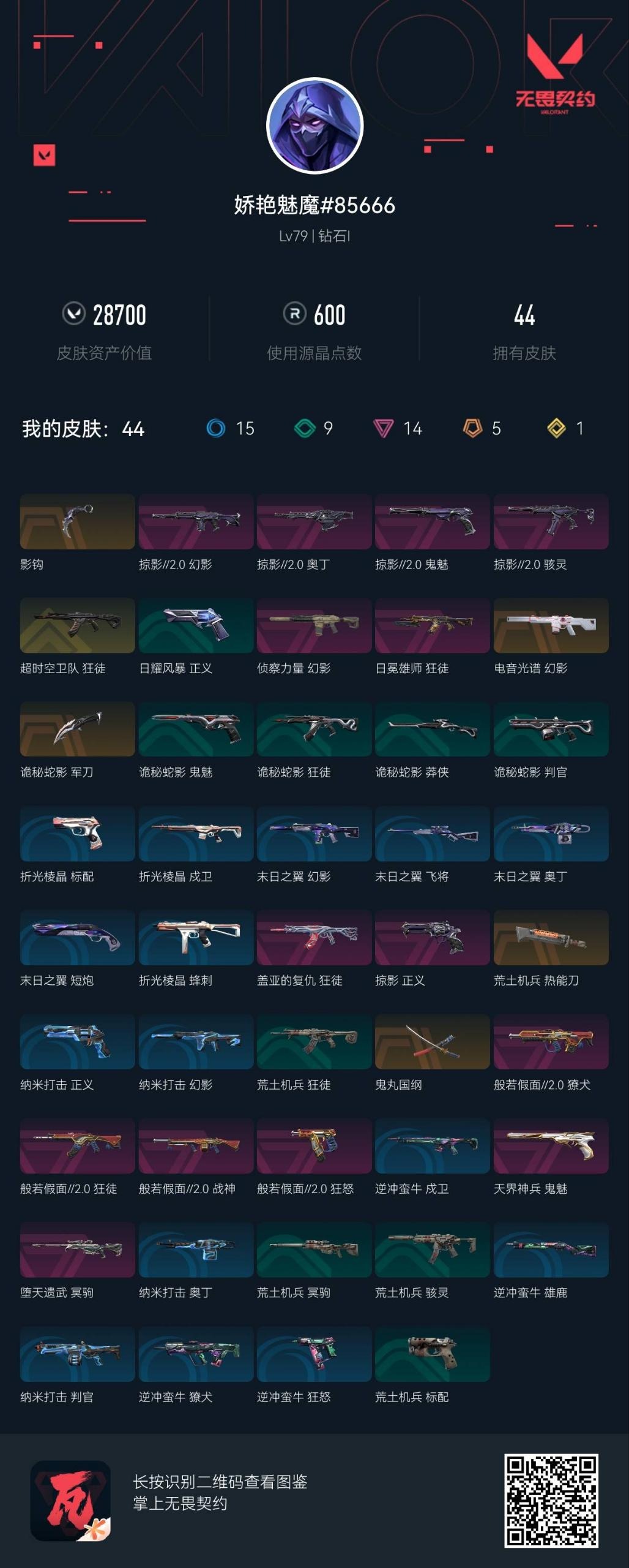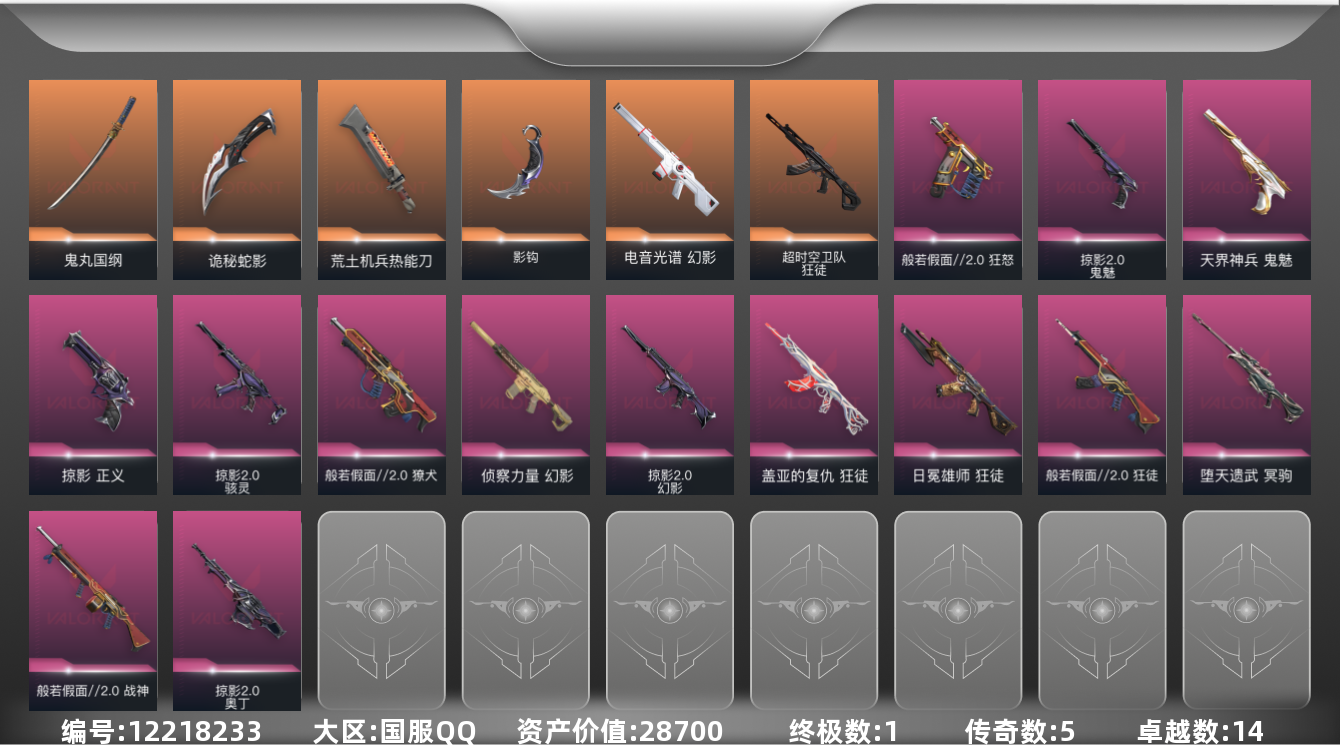 [12218233]5橙皮 1金皮 14紫皮 44皮肤 20英雄 73卡面 600已用源晶 钻石 优质装备:狂徒-盖亚的复仇,幻影-侦察力量,冥驹-堕天遗武,狂徒-日冕雄师,正义-掠影,鬼魅-天界神兵,荒土机兵热能刀,鬼丸国纲,诡秘蛇影,影钩 套装:般若假面//2.0套装,掠影2.0套装 佩枪皮肤:狂怒-般若假面//2.0,鬼魅-掠影2.0 冲锋枪皮肤:骇灵-掠影2.0 步枪皮肤:狂徒-般若假面//2.0,獠犬-般若假面//2.0,幻影-电音光谱,幻影-掠影2.0,狂徒-超时空卫队 机枪皮肤:战神-般若假面//2.0,奥丁-掠影2.0