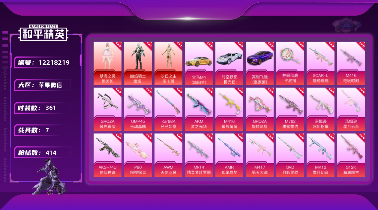 - PX_1985352- 腾讯信用分202 安卓手Q-11王牌印记-8粉装-3特效枪-1载具-65279热力值-157套装-173枪皮-0卓越印记-0传奇印记 【8粉装】,初号机 觉醒Ver.,星梦奇缘,千金淑猫,未来领航者,憨憨奶龙,霓虹漫游,美雪,幻影战神 【3特效枪】M416-电玩时刻-5级 M24-镜域双华-3级 DP-28-千金淑猫-2级 【1红装】,镜域双华-欧若拉, 【1稀有载具】,