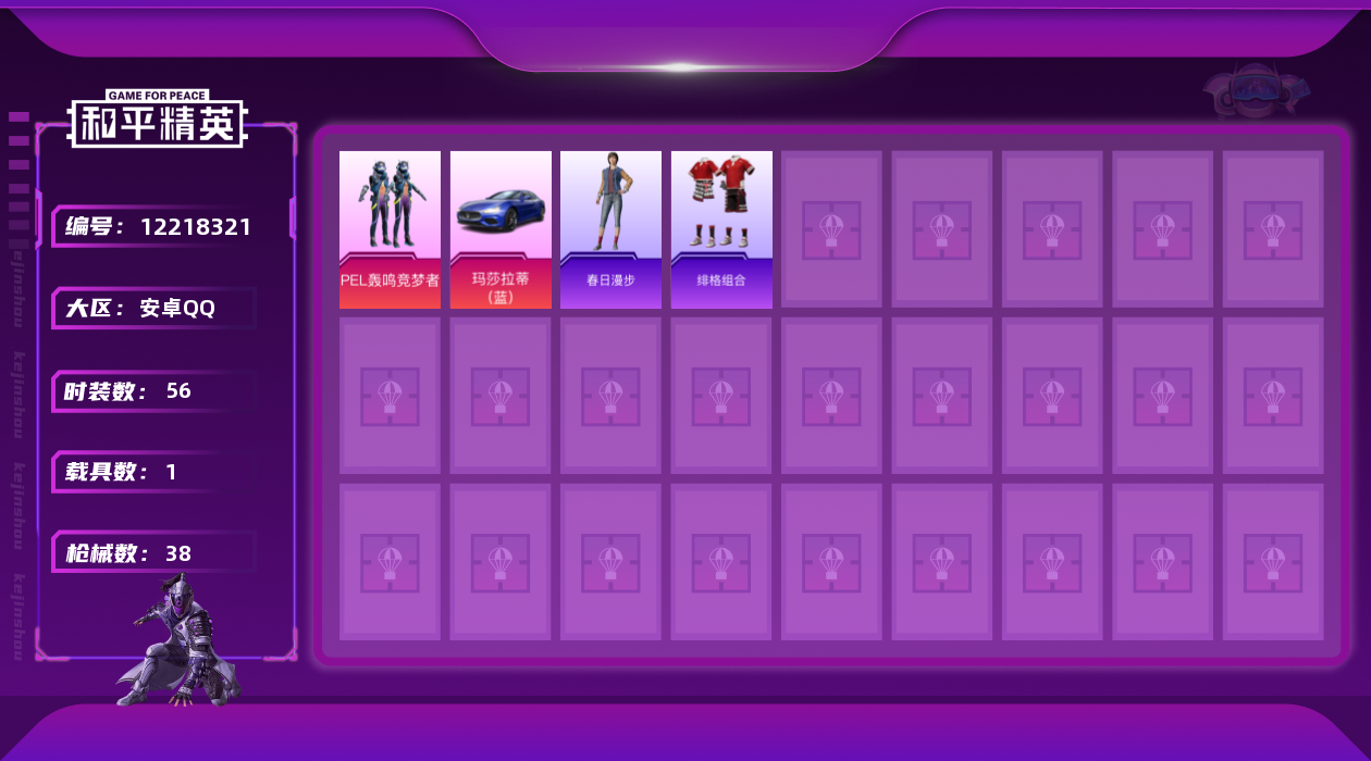 - PX_2096499- 苹果手Q-2王牌印记-4粉装-2特效枪-1载具-41638热力值-110套装-118枪皮-0卓越印记-0传奇印记 【4粉装】,梦幻火箭,草莓生巧,红伞翩翩,数码大师 【2特效枪】M416-心之恋语-7级 Kar98K-巳巳如意-5级 【5稀有紫装】,奇异狩猎者,浪漫天命,浪漫波比,龟仙人,金羽特工, 【1稀有载具】,阿斯顿·马丁DBS(红), 【111稀有时装】,SS31