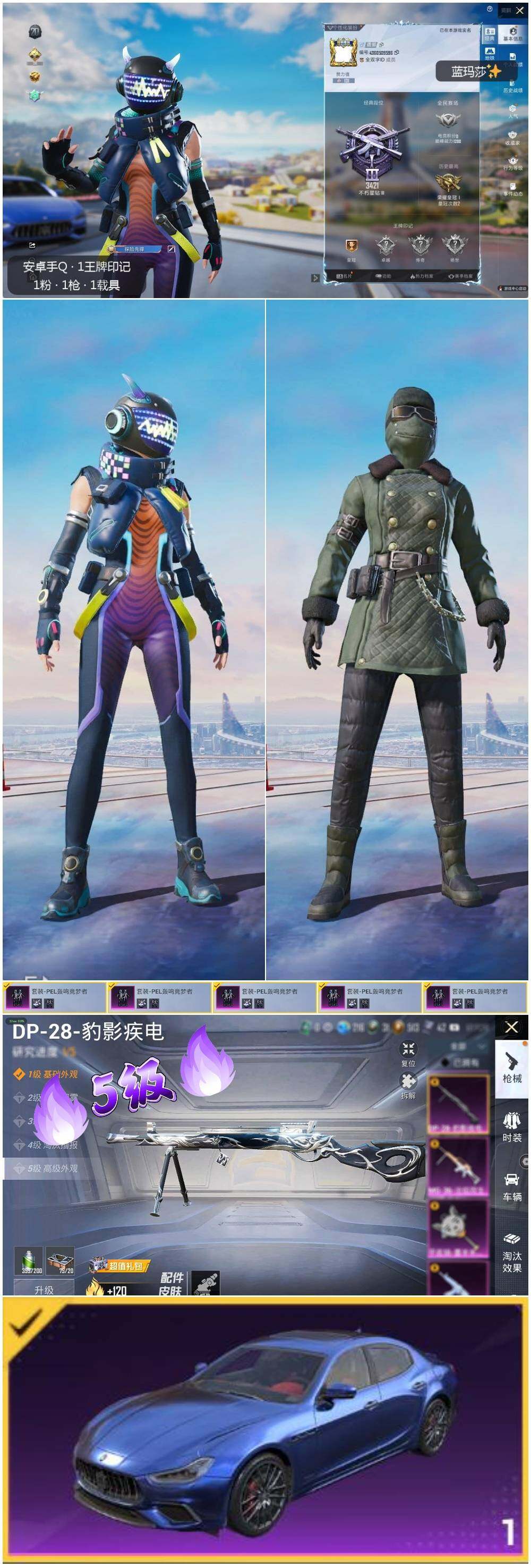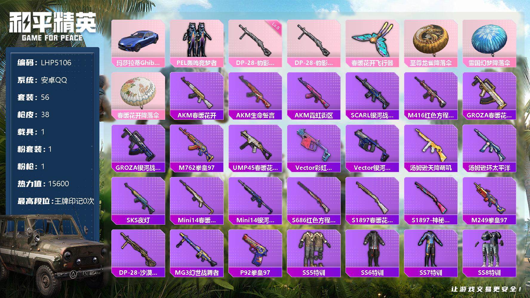[12218321]【特价急出/详情看图】:安卓 手Q-1粉装-1特效枪-1载具-1粉色飞行器-1.5w热力值-1王牌印记-56套装-38枪皮【粉色载具】:玛莎拉蒂Ghibli(蓝)【粉色套装】:粉装-PEL轰鸣竞梦者【粉色枪皮等级】:DP-28-豹影疾电(五级)【粉色飞行器】:春暖花开飞行器