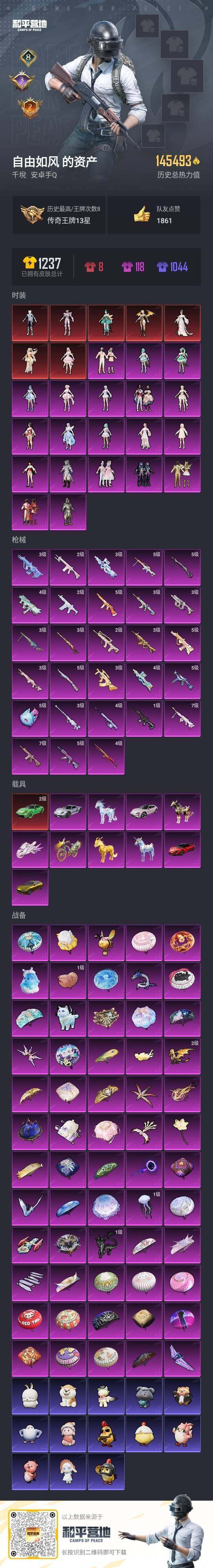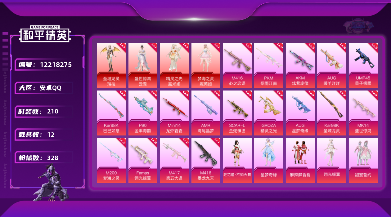 - PX_2089225- 包人脸 安卓手Q-8王牌印记-6粉装-8特效枪-1载具-56303热力值-118套装-162枪皮-1卓越印记-0传奇印记, 【6粉装】,筑梦精灵,冰霜白皇,炙焰红王,山涧鹿灵,未来歌姬,创世·救赎, 【8特效枪】,AKM-炫紫旋律-5级,SCAR-L-锦绣绵绵-5级,M416-风花雪月-7级,Kar98K-巳巳如意-4级,AMR-鸢尾晶梦-6级,VSS-烈焰拳霸-5级,UM