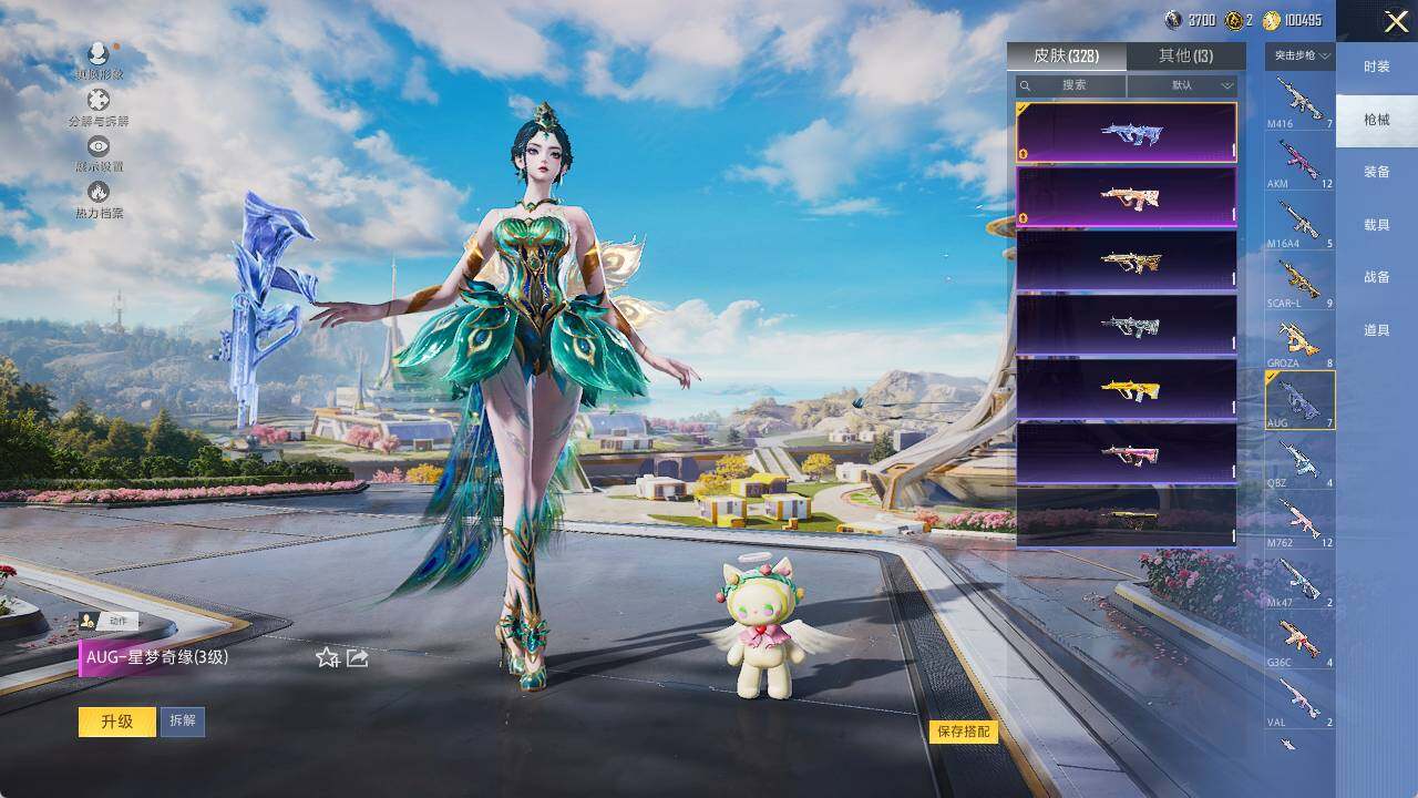 AKM-炫紫旋律,SCAR-L-金蛇镇世,M416-心之恋语,M416-墨龙九天,GROZA-精灵之光,AUG-星梦奇缘,AUG-暖羊咩咩,UMP45-量子极限,P90-金丰海韵,Kar98K-巳巳如意,Kar98K-圣域龙灵,Mini14-龙虾霸霸,Mk14-盛世惊鸿,AMR-鸢尾晶梦,M417-第五大道,M200-梦海之灵,PKM-江南烟雨,破片手榴弹-粉粉猫爪