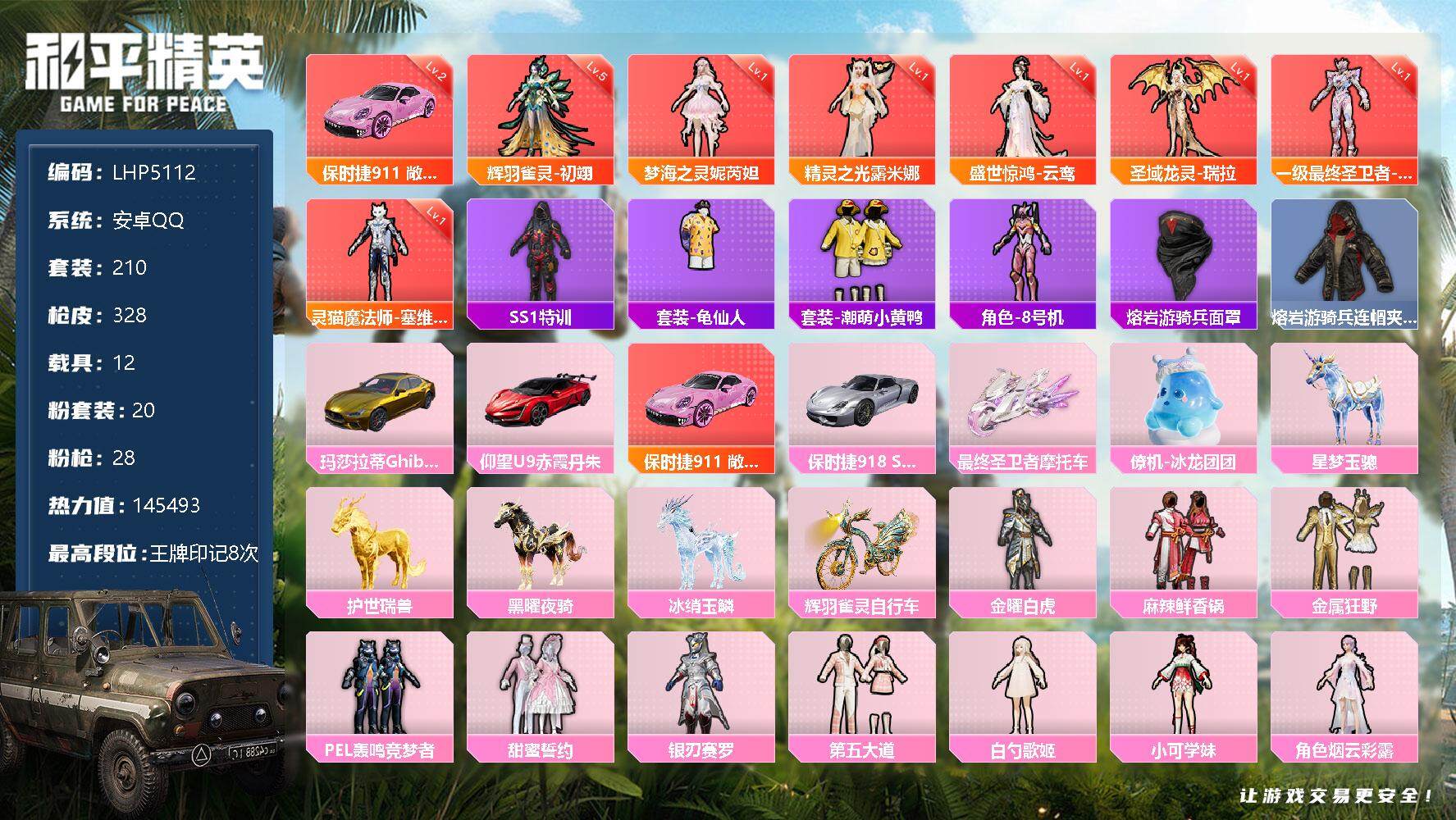 [12218275]素材身法号/5级红装7套可随意切换【特价急出/详情看图】:安卓 手Q-7神装-20粉装-28特效枪-12载具-19粉色飞行器-14.5w热力值-8王牌印记-210套装-328枪皮【红色载具】:保时捷911 敞篷版(小暴龙)(二级)【红色神装等级】:灵猫魔法师-塞维尔(一级),最终圣卫者-帕修斯(一级),辉羽雀灵-初翊(五级),圣域龙灵-瑞拉(一级),盛世惊鸿-云鸾(一级),精灵之光-露米娜(一级),梦海之灵-妮芮妲(一级【热门品类】:套装-SS1特训,套装-龟仙人,套装-潮萌小黄鸭,角色-8号机,熔岩游骑兵面罩,熔岩游骑兵连帽夹克【粉色载具】:玛莎拉蒂Ghibli(金),仰望U9(赤霞丹朱),保时捷911 敞篷版(小暴龙),保时捷918 Spyder(液态银),最终圣卫者摩托车,僚机-冰龙团团,星梦玉骢,护世瑞兽,黑曜夜骑,冰绡玉鳞,辉羽雀灵自行车【粉色套装】:粉装-金曜白虎,粉装-麻辣鲜香锅,粉装-金属狂野,粉装-PEL轰鸣竞梦者,粉装-甜蜜誓约,粉装-银刃赛罗,粉装-第五大道,角色-白勺歌姬,角色-小可学妹,角色-烟云彩露,角色-鸢尾晶梦,角色-星梦奇缘,角色-狂花道·不知火舞,角色-翎光蝶翼,粉装-星穹咏叹调,角色-荧海星豚,角色-奇迹舞步 贝贝,角色-奇迹舞步 雅雅,角色-奇迹舞步 美琪,角色-奇迹舞步 美雪【粉色枪皮等级】:AKM-炫紫旋律(五级),SCAR-L-金蛇镇世(三级),M416-心之恋语(七级),M416-墨龙九天(一级),M416-灵猫魔法师(三级),GROZA-精灵之光(三级),AUG-星梦奇缘(三级),AUG-暖羊咩咩(五级),蜜獾-荧海星豚(二级),Famas-翎光蝶翼(二级),UMP45-量子极限(五级),Vector-最终圣卫者(三级),汤姆逊-热量炸弹(五级),JS9-奇迹舞步(四级),P90-金丰海韵(四级),P90-魔童闹海 敖丙(三级),Kar98K-巳巳如意(五级),Kar98K-圣域龙灵(三级),Mini14-龙虾霸霸(四级),Mk14-盛世惊鸿(三级),AMR-鸢尾晶梦(四级),M417-第五大道(二级),M200-梦海之灵(三级),DP-28-豹影疾电(五级),MG3-辉羽雀灵(三级),PKM-江南烟雨(七级),MG-36-沧焰双生(五级)