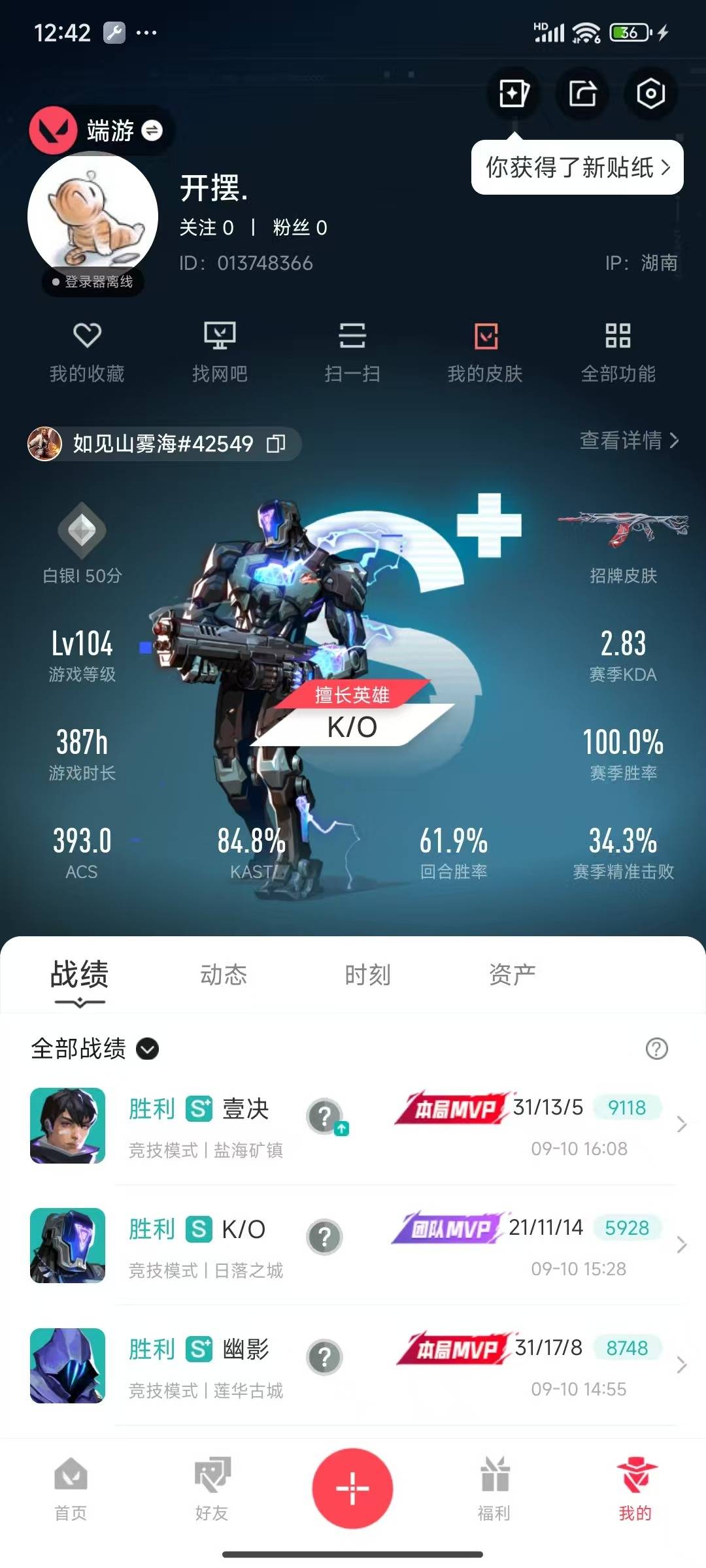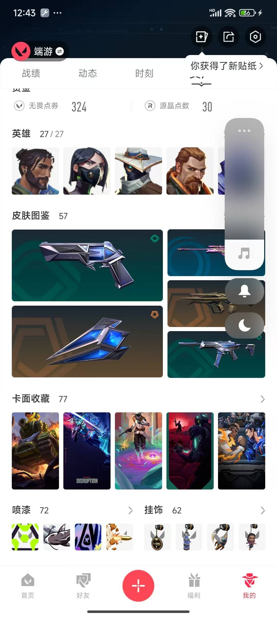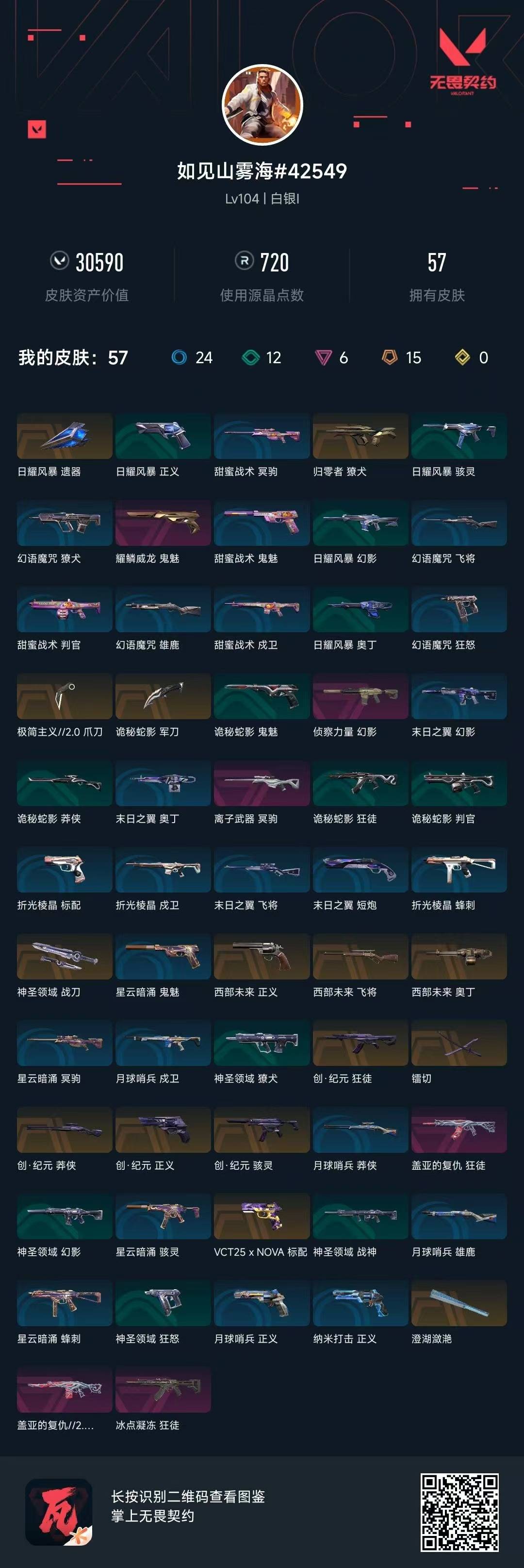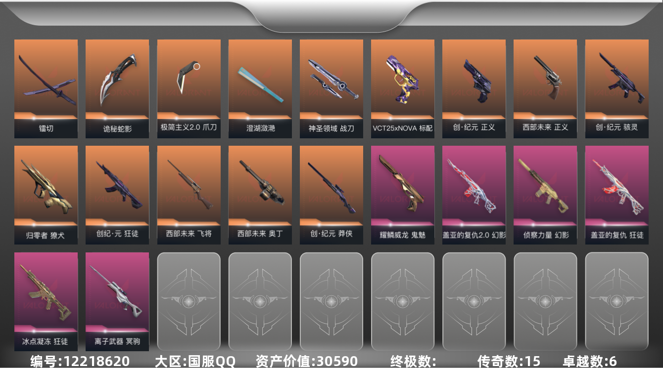[12218620]15橙皮 6紫皮 57皮肤 27英雄 77卡面 720已用源晶 白银 优质装备:狂徒-盖亚的复仇,幻影-侦察力量,獠犬-归零者,幻影-盖亚的复仇2.0,冥驹-离子武器,澄湖潋滟,狂徒-冰点凝冻,镭切,神圣领域 战刀,诡秘蛇影,极简主义2.0 爪刀,鬼魅-耀鳞威龙 套装:创·纪元套装 佩枪皮肤:正义-创·纪元,正义-西部未来,标配-VCT25xNOVA 冲锋枪皮肤:骇灵-创·纪元 步枪皮肤:狂徒-创·纪元 狙击枪皮肤:莽侠-创·纪元,飞将-西部未来 机枪皮肤:奥丁-西部未来