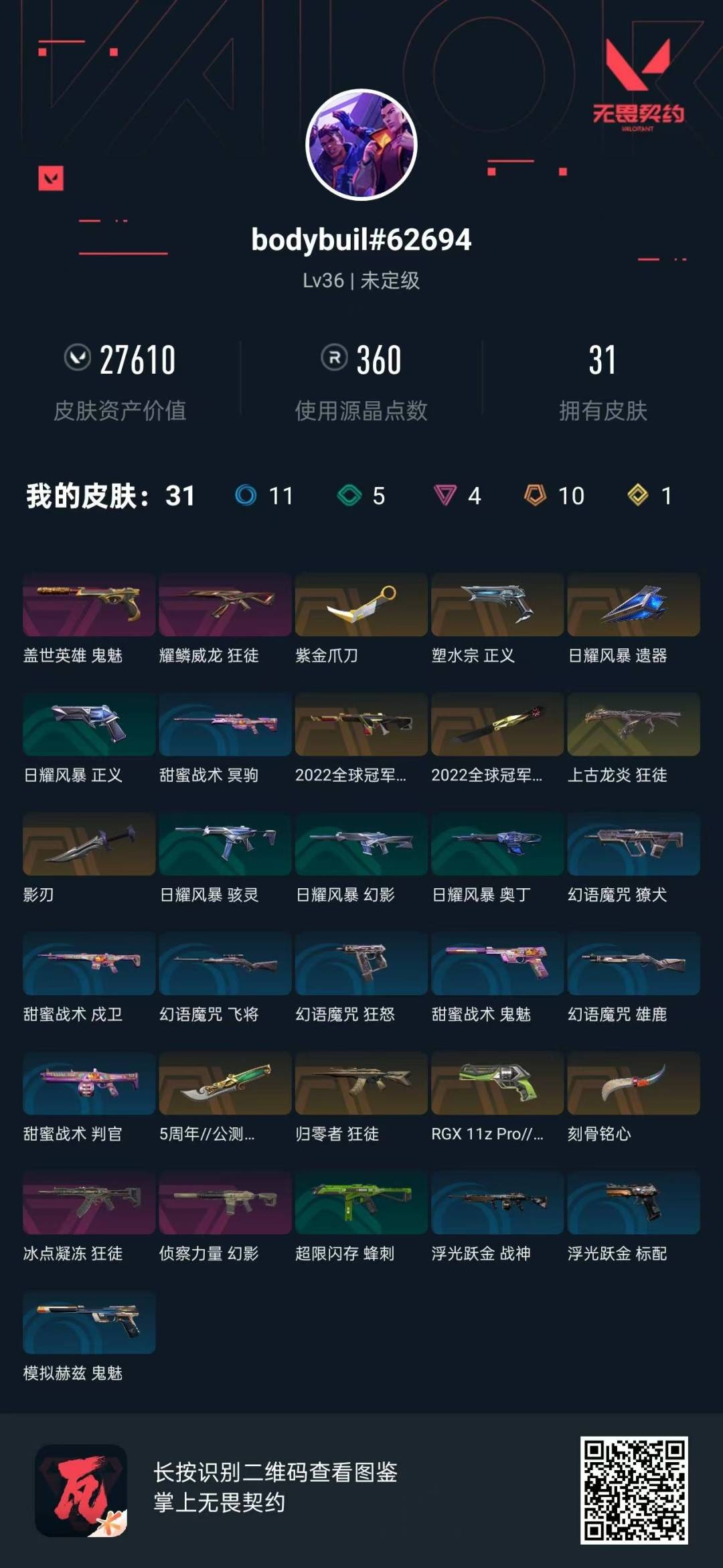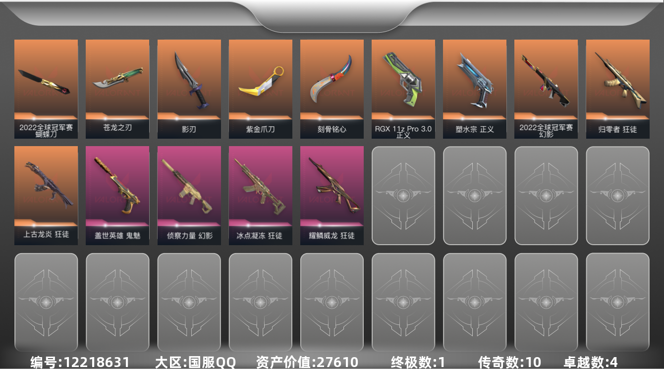 [12218631]10橙皮 1金皮 4紫皮 31皮肤 11英雄 34卡面 360已用源晶 未定级 优质装备:狂徒-归零者,幻影-侦察力量,正义-塑水宗,正义-RGX 11z Pro 3.0,狂徒-冰点凝冻,鬼魅-盖世英雄,紫金爪刀,狂徒-耀鳞威龙,影刃,刻骨铭心,苍龙之刃 亮点皮肤:幻影-2022全球冠军赛,2022全球冠军赛 蝴蝶刀 套装:2022全球冠军赛 步枪皮肤:狂徒-上古龙炎