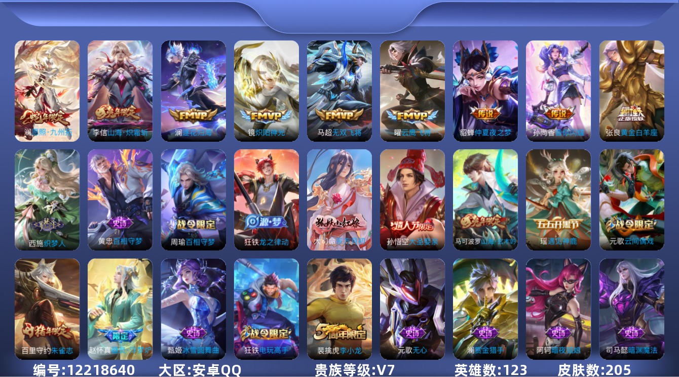 [12218640]V7 9传说 123英雄 205皮肤 可修改实名 优质装备:云鹰飞将(小将军),黄金白羊座,炽阳神光,仲夏夜之梦(大飞蛾),无双飞将,音你闪耀(rap皮),山海·炽霜斩(李信年限),澜逐花归海 珍宝阁皮:蔷薇恋人,玩趣恶龙 限定皮:愿照·九州拓(澜年限),瑞麟志(木兰年限),五谷丰年,李小龙,朱雀志(守约年限),大圣娶亲,山海·玄木吟(马可年限) 史诗皮:器灵·浮梦炉,星界战将,龙之律动,百相守梦-周瑜,茶境仙,怒海争锋,东方月初,百相守梦-黄忠,织梦人,遇见神鹿,苍穹之光,千年之狐,偶像歌手,暗夜猫娘,乱世虎臣,节奏热浪,女仆咖啡,摇滚巨星,水果甜心,天才门将,星夜王子,心灵骇客,功夫厨神,鬼剑武藏,暗渊魔法,心灵战警,地狱岩魂,乘风破浪,逐浪之夏,水晶猎龙者,金属风暴,原初追逐者,圣诞狂欢,鹰眼统帅,魅力维加斯,赏金猎手,无心,未来纪元-赵云