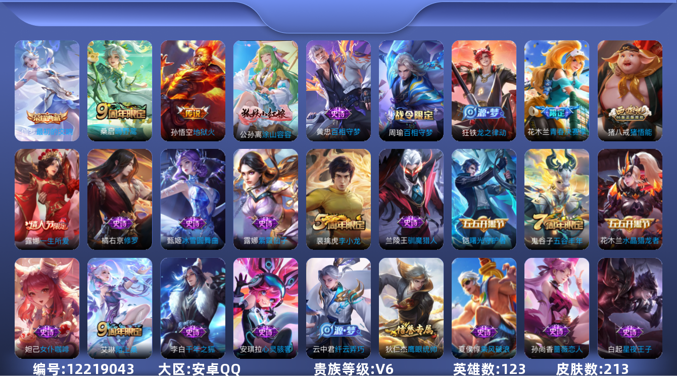 [12219043]V6 1典藏 2传说 123英雄 213皮肤 可修改实名 优质装备:最初的交响(伽罗典藏),地狱火,涂山容容 珍宝阁皮:蔷薇恋人,玩趣恶龙 限定皮:陌上桑,鸣野蒿,遇见飞天,高山流水,五谷丰年,梁祝,李小龙,猪悟能,一生所爱,青春决赛季 史诗皮:龙之律动,百相守梦-周瑜,百相守梦-黄忠,紫霞仙子,苍穹之光,千年之狐,蒙恬荣光圣徽,冰冠公主,偶像歌手,龙骑士(小龙虾),猫狗日记-孙策,修罗,女仆咖啡,水果甜心,星夜王子,心灵骇客,德古拉伯爵,暗隐猎兽者,鬼剑武藏,心灵战警,舞动绿茵,地狱岩魂,纤云弄巧,繁星吟游(呼啦呼啦),缤纷独角兽,乘风破浪,逐浪之夏,月团寄思,水晶猎龙者,曙光守护者,金属风暴,原初追逐者,圣诞恋歌,鹰眼统帅,魅力维加斯,黎明之约,未来纪元-赵云