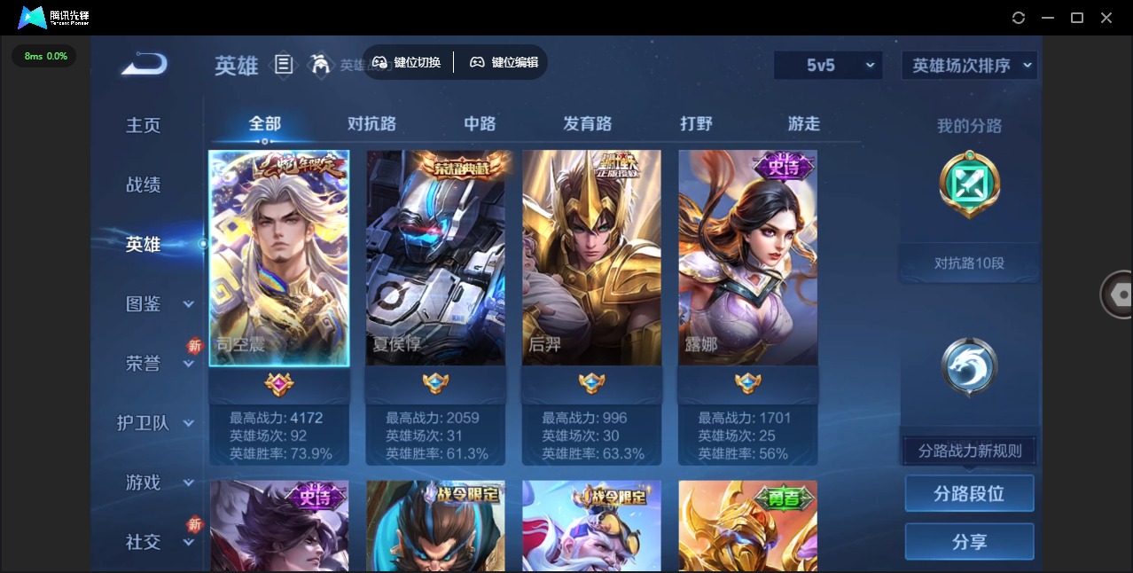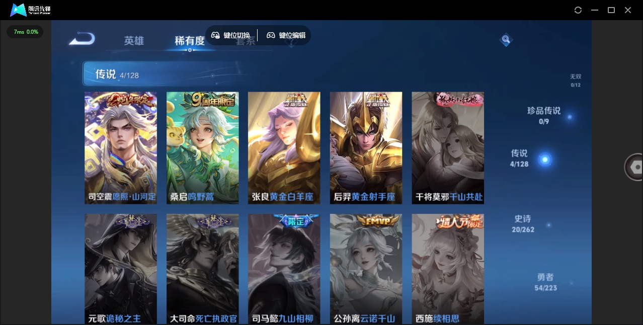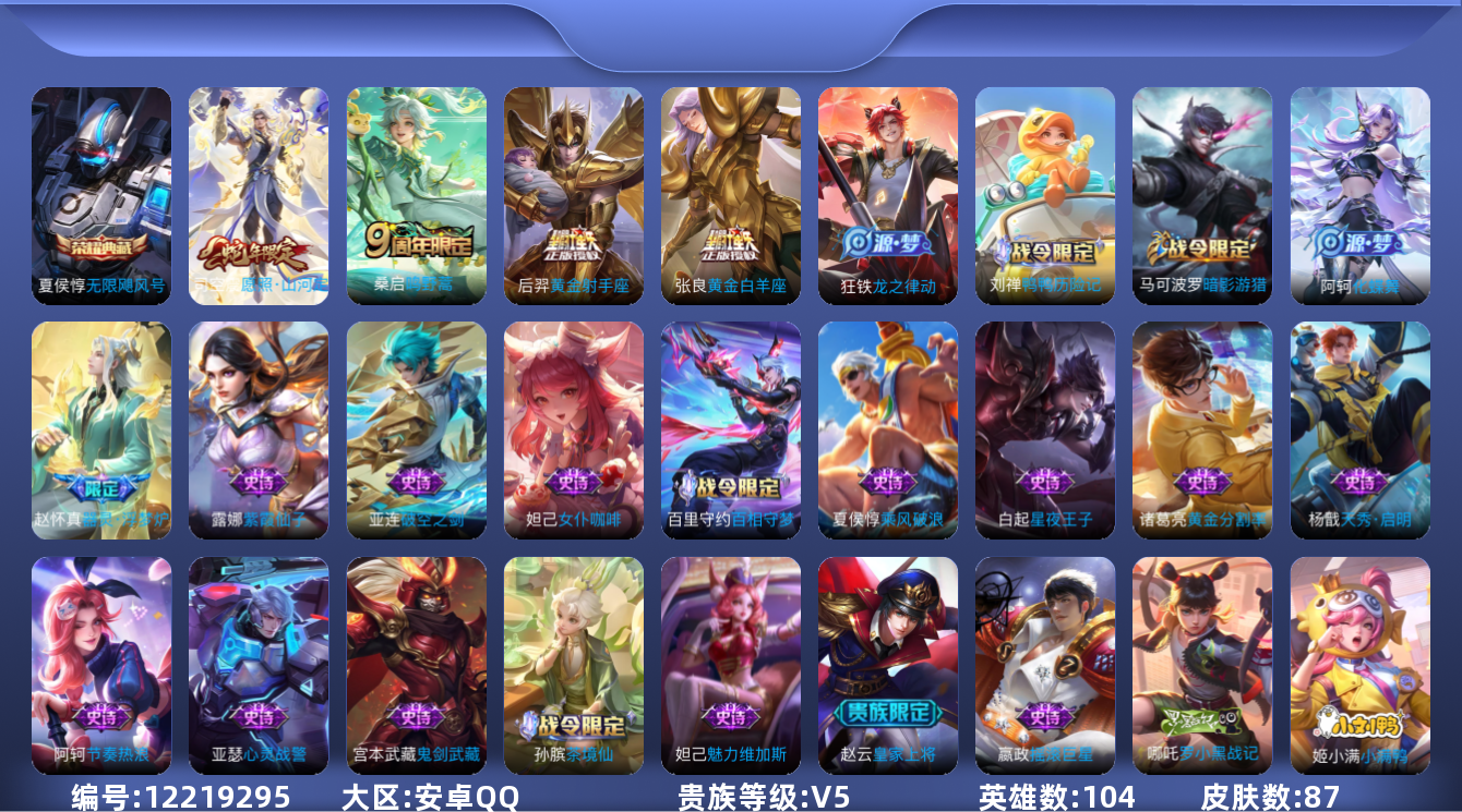 [12219295]V5 1典藏 4传说 104英雄 87皮肤 可修改实名 优质装备:无限飓风号(高达),黄金射手座,黄金白羊座 限定皮:愿照·山河定(司空震年限),逐霄战戟,鸣野蒿 史诗皮:鸭鸭历险记-刘禅,器灵·浮梦炉,化蝶舞,龙之律动,茶境仙,破空之剑,百相守梦-百里守约,紫霞仙子,黄金分割率,节奏热浪,女仆咖啡,摇滚巨星,星夜王子,鬼剑武藏,心灵战警,天秀·启明,乘风破浪,魅力维加斯