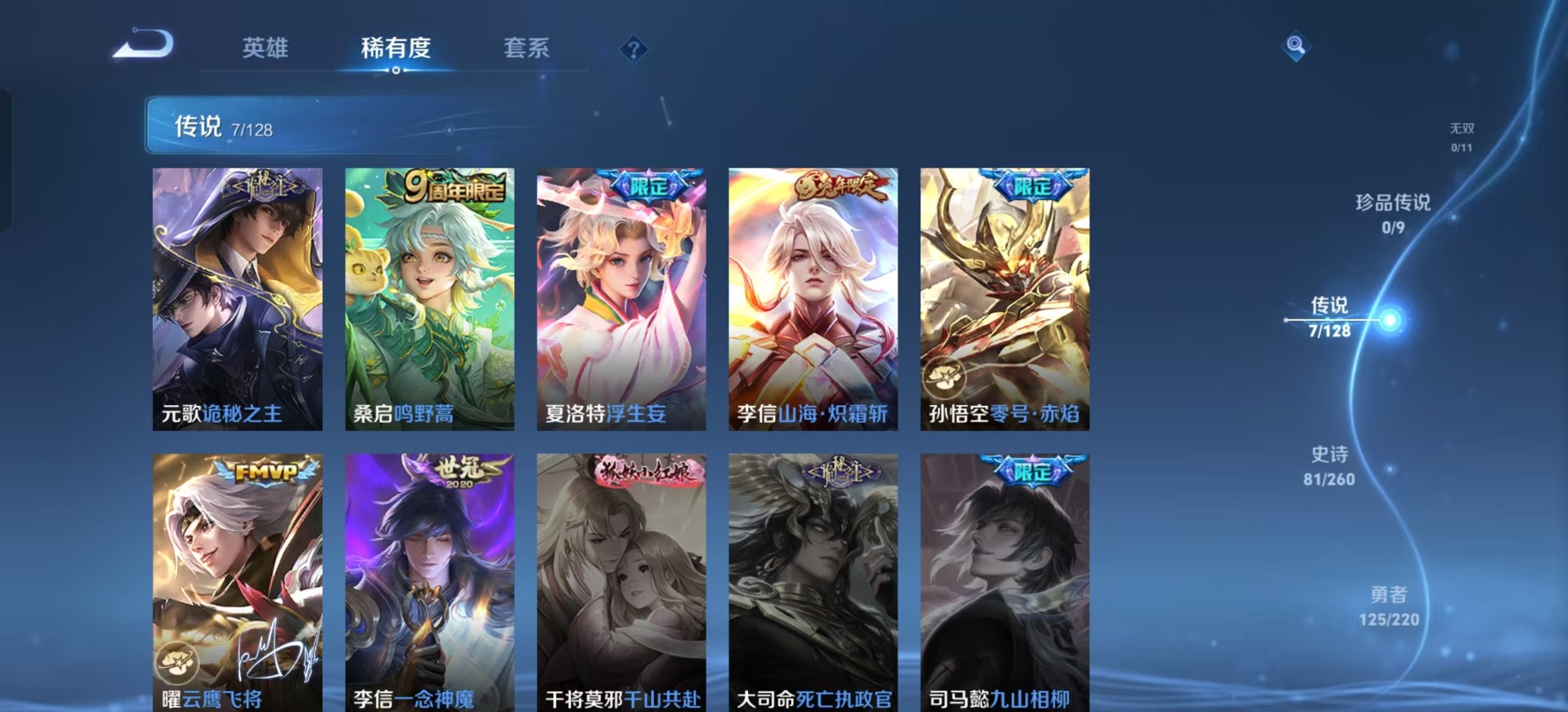 - PX_2093007-贵族等级: V6 英雄数: 123 皮肤数: 177 星传说: 金色仲夏夜 传说皮: 仲夏夜之梦 限定皮: 李小龙,梁祝,时雨天司,高山流水,五谷丰年