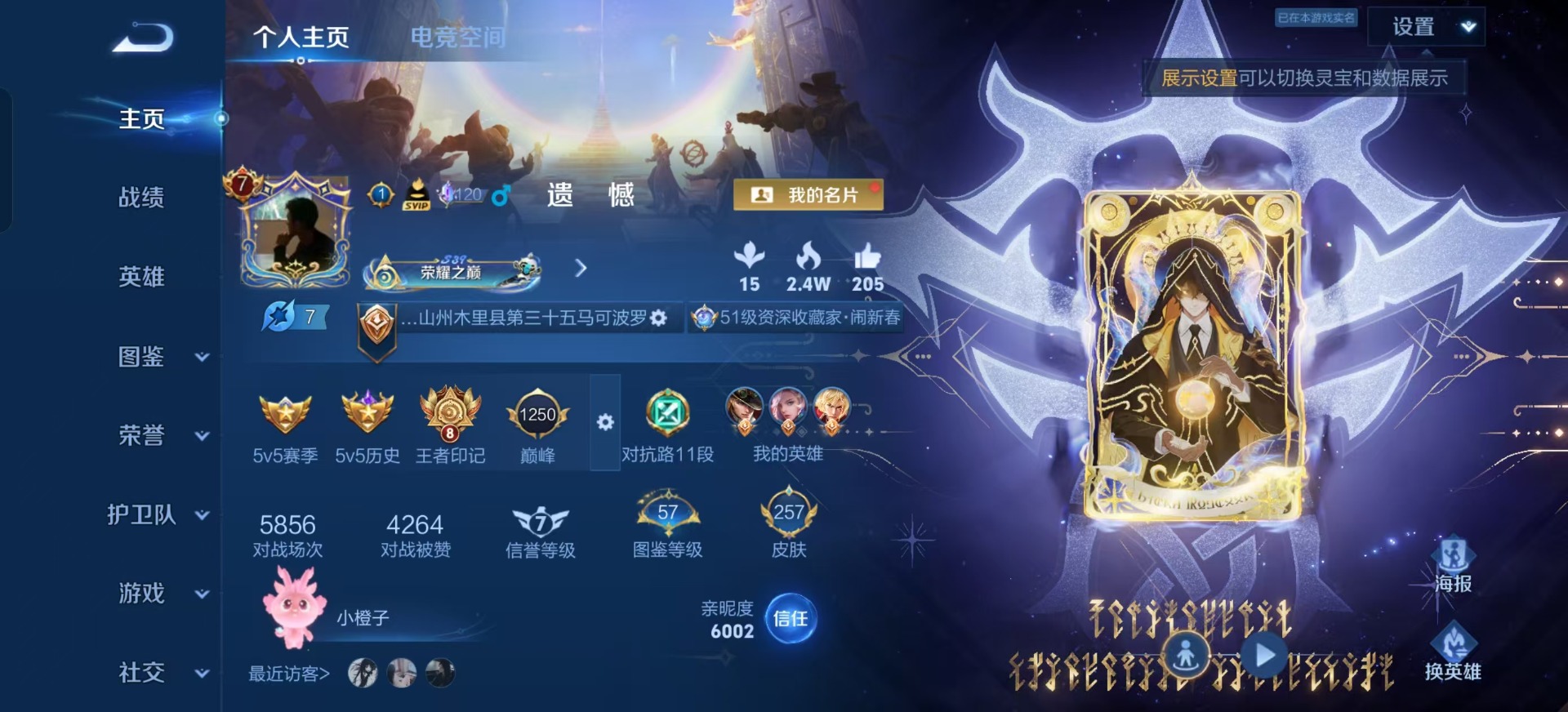 [12219704]V8 1典藏 7传说 124英雄 257皮肤 可修改实名 连体和平 优质装备:弑枪猎影(韩信典藏),云鹰飞将(小将军),一念神魔,零号·赤焰,山海·炽霜斩(李信年限),浮生妄,诡秘之主,涂山容容 珍宝阁皮:万物之道,蔷薇恋人 限定皮:逐霄战戟,鸣野蒿,降魔,五谷丰年,梁祝,山海·玄木吟(马可年限) 史诗皮:化蝶舞,灵蛊蚀心,龙之律动,雪豹·霜爪,石田雨龙,百相守梦-周瑜,茶境仙,破空之剑,蔬乡物语(鲁班七号),百相守梦-百里守约,百相守梦-黄忠,紫霞仙子,黄金分割率,特工魅影,千年之狐,江河有灵,真我赫兹(百里守约),百解令(蒙犽),高渐离燃音魔法,蒙恬荣光圣徽,匿光破解者,冰冠公主,青蛇,偶像歌手,晚萤,电玩·爆裂旋风,暗夜猫娘,百相守梦(关羽),末日机甲-吕布,猫狗日记-孙策,时之恋人-孙尚香,节奏热浪,修罗,摇滚巨星,水果甜心,心灵骇客,功夫厨神,德古拉伯爵,暗隐猎兽者,幽灵船长,鬼剑武藏,暗渊魔法,心灵战警,地狱岩魂,缤纷独角兽,乘风破浪,逐浪之夏,水晶猎龙者,曙光守护者,热力回旋,箭羽风息,金属风暴,原初追逐者,圣诞狂欢,圣诞恋歌,鹰眼统帅,暗夜贵公子,魅力维加斯,赏金猎手,滕王阁序,无心,未来纪元-赵云,玫瑰异探