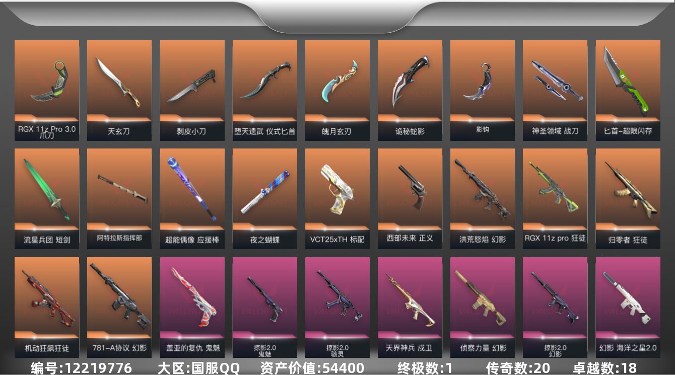 [12219776]20橙皮 1金皮 18紫皮 136皮肤 27英雄 168卡面 1615已用源晶 铂金 优质装备:狂徒-归零者,幻影-781-A协议,狂徒-掠影,狂徒-紫阙金琅,狂徒-盖亚的复仇,幻影-侦察力量,狂徒-机动狂飙,冥驹-堕天遗武,幻影-洪荒怒焰,鬼魅-盖亚的复仇,魄月玄刃,狂徒-起源,戍卫-天界神兵,飞将-天界神兵,天玄刀,狂徒-盖世英雄,剥皮小刀,堕天遗武 仪式匕首,夜之蝴蝶,爪刀-RGX 11z Pro 3.0,匕首-超限闪存,神圣领域 战刀,诡秘蛇影,阿特拉斯指挥部,影钩 套装:掠影2.0套装 佩枪皮肤:标配-VCT25xTH,鬼魅-掠影2.0,正义-西部未来 冲锋枪皮肤:骇灵-掠影2.0 步枪皮肤:幻影-海洋之星2.0,狂徒-般若假面//2.0,幻影-掠影2.0,RGX 11z pro 狂徒,狂徒-离子武器2.0,狂徒-堕天遗武 机枪皮肤:奥丁-掠影2.0 近战武器皮肤:短剑-流星兵团,超能偶像 应援棒