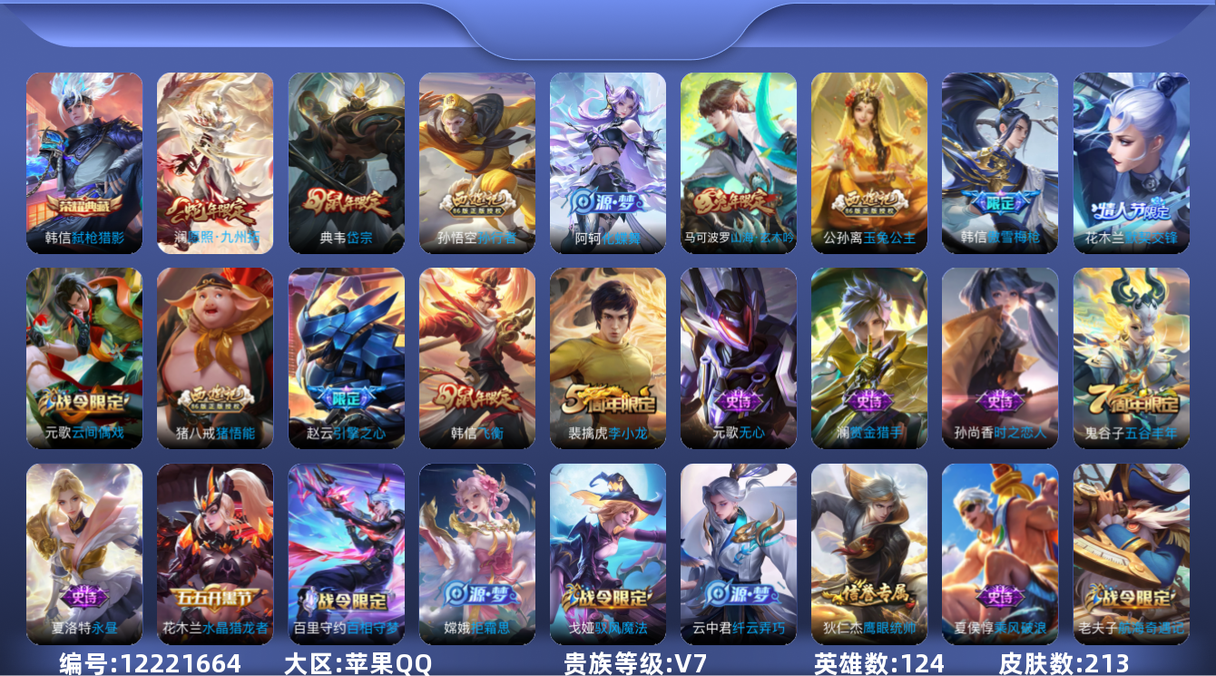 - [11526643]V7 2典藏 1珍品传说 8传说 125英雄 260皮肤 可修改实名 优质装备:鸣剑·曳影,弑枪猎影(韩信典藏),绛天战甲(鸡嘴战神),挚爱之约,山海·苍雷引(电光曜子) 珍品传说:时之奇旅-孙策 传说皮:乘龙·淬吴钩(孙策年限),幻光神枪 珍宝阁皮:妄想食味,蔷薇恋人 限定皮:愿照·九州拓(澜年限),逐霄战戟,鸣野蒿,傲雪梅枪,齐天大圣,五谷丰年,梁祝,岱宗(典韦年限),孙行者 史诗皮:鸭鸭历险记-刘禅,器灵·浮梦炉,化蝶舞,灵蛊蚀心,星界战将,谪仙醉月,龙之律动,石田雨龙,百相守梦-周瑜,茶境仙,怒海争锋,破空之剑,蒙犽顽岩魄,琥珀纪元伽罗,百相守梦-百里守约,织梦人,白龙吟,特工魅影,江河有灵,雪夜绮愿(周瑜),百解令(蒙犽),高渐离燃音魔法,蒙恬荣光圣徽,冰冠公主,青蛇,电玩·爆裂旋风,暗夜猫娘,猫狗日记-孙策,时之恋人-孙尚香,节奏热浪,女仆咖啡,水果甜心,星夜王子,功夫厨神,德古拉伯爵,暗隐猎兽者,幽灵船长,鬼剑武藏,心灵战警,舞动绿茵,地狱岩魂,纤云弄巧,繁星吟游(呼啦呼啦),拒霜思,缤纷独角兽,乘风破浪,逐浪之夏,水晶猎龙者,箭羽风息,金属风暴,原初追逐者,圣诞狂欢,圣诞恋歌,鹰眼统帅,暗夜贵公子,魅力维加斯,无心,未来纪元-赵云