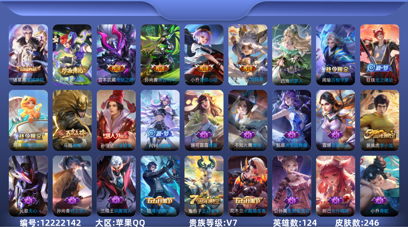 [12222142]V7 1典藏 1珍品传说 4传说 124英雄 246皮肤 可修改实名 优质装备:星域神启(倪克斯贼亮),末日机甲-孙尚香(绿蚂蚱),音你心动-小乔,地狱之眼,飞鸢探春 珍品传说:时之奇旅-孙策 珍宝阁皮:蔷薇恋人 限定皮:神威(电光马子),遇见飞天,五谷丰年,梁祝,李小龙,逐梦之影,纯白花嫁,大圣娶亲,神器·万象笔 史诗皮:鸭鸭历险记-刘禅,化蝶舞,龙之律动,百相守梦-周瑜,茶境仙,织梦人,紫霞仙子,黄金分割率,千年之狐,青蛇,魅语,无限星赏官,晚萤,偶像歌手,龙骑士(小龙虾),末日机甲-吕布,猫狗日记-孙策,时之恋人-孙尚香,乱世虎臣,节奏热浪,女仆咖啡,摇滚巨星,水果甜心,天才门将,星夜王子,功夫厨神,德古拉伯爵,暗隐猎兽者,幽灵船长,鬼剑武藏,心灵战警,乐园奇幻夜,天秀·启明,纤云弄巧,乘风破浪,逐浪之夏,水晶猎龙者,曙光守护者,热力回旋,金属风暴,原初追逐者,圣诞狂欢,圣诞恋歌,鹰眼统帅,无心,未来纪元-赵云
