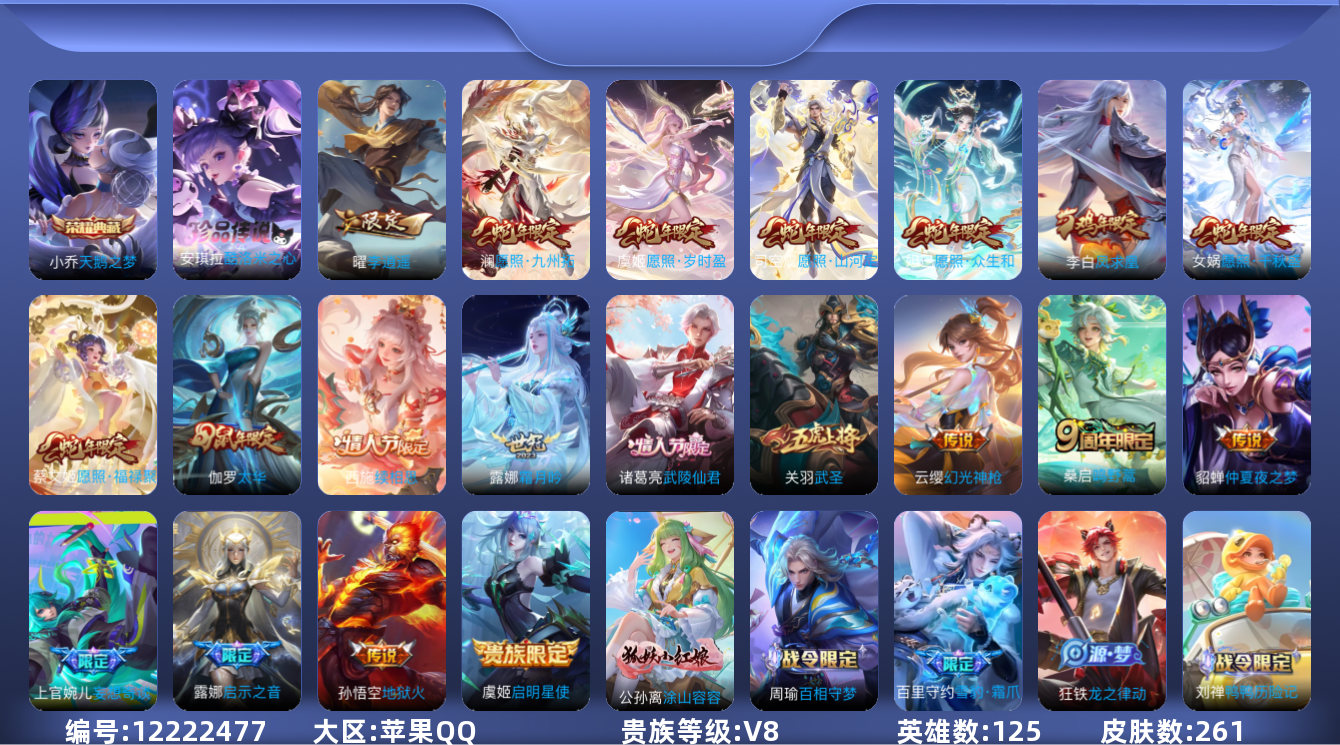 [12222477]V8 1典藏 1珍品传说 20传说 125英雄 261皮肤 可修改实名 优质装备:天鹅之梦(小乔典藏),酷洛米之心,地狱火,仲夏夜之梦(大飞蛾),李逍遥,妄想奇谈,霜月吟,涂山容容 传说皮:续相思,幻光神枪 珍宝阁皮:女武神,玩趣恶龙 限定皮:愿照·九州拓(澜年限),愿照·福禄聚(蔡文姬年限),愿照·岁时盈(虞姬年限),愿照·山河定(司空震年限),愿照·众生和(妲己年限),愿照·千秋盛(女娲年限),逐霄战戟,鸣野蒿,至尊宝,凤求凰(白切鸡),凤凰于飞,太华(伽罗年限),武陵仙君(小桃花),飞衡(韩信年限),武圣,梁祝,李小龙,逐梦之影,辉光之辰,一生所爱,大圣娶亲,启示之音 史诗皮:鸭鸭历险记-刘禅,苍鳞隐世,器灵·浮梦炉,化蝶舞,龙之律动,雪豹·霜爪,星界战将,百相守梦-周瑜,茶境仙,蒙犽顽岩魄,紫霞仙子,特工魅影,千年之狐,青蛇,蒙恬荣光圣徽,魅语,偶像歌手,节奏热浪,女仆咖啡,水果甜心,天才门将,心灵骇客,功夫厨神,暗隐猎兽者,鬼剑武藏,地狱岩魂,纤云弄巧,繁星吟游(呼啦呼啦),乘风破浪,水晶猎龙者,原初追逐者,鹰眼统帅,魅力维加斯