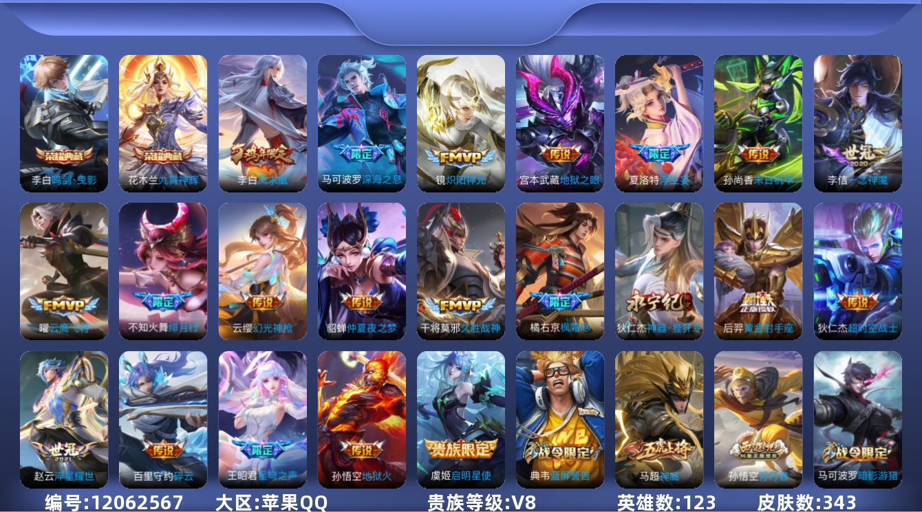 [12062567]V8 2典藏 21传说 123英雄 343皮肤 可修改实名 连体和平 优质装备:鸣剑·曳影,九霄神辉(木兰典藏),黄金射手座,云鹰飞将(小将军),久胜战神,炽阳神光,一念神魔,末日机甲-孙尚香(绿蚂蚱),地狱火,仲夏夜之梦(大飞蛾),地狱之眼,淬星耀世,超时空战士-狄仁杰,碎云,神器·狴犴令,浮生妄 传说皮:幻光神枪 珍宝阁皮:优雅恋人,女武神 限定皮:凤求凰(白切鸡),傲雪梅枪,星穹之声,绯月行,神威(电光马子),飞衡(韩信年限),山海·碧波行(瑶年限),遇见飞天,高山流水,五谷丰年,冰锋战神,游园惊梦,梁祝,天狼狩猎者,逐梦之翼,天狼溯光者,李小龙,逐梦之影,朱雀志(守约年限),霸王别姬-虞姬,默契交锋-花木兰,孙行者,大圣娶亲,青春决赛季,蜜橘之夏,匿光追影者,深海之息(深海大菠萝),枫霜尽,匿光启智者,时之奇旅-妲己,梦圆繁星 史诗皮:遇见神鹿,紫霞仙子,苍穹之光,白龙吟,黄金分割率,特工魅影,千年之狐,魅语,无限星赏官,匿光破解者,冰冠公主,偶像歌手,龙骑士(小龙虾),末日机甲-吕布,猫狗日记-孙策,猫狗日记-大乔,乱世虎臣,节奏热浪,修罗,女仆咖啡,摇滚巨星,水果甜心,绅士熊喵,天才门将,星夜王子,心灵骇客,时之奇旅-安琪拉,功夫厨神,德古拉伯爵,暗隐猎兽者,幽灵船长,鬼剑武藏,心灵战警,天秀·启明,舞动绿茵,地狱岩魂,纤云弄巧,繁星吟游(呼啦呼啦),拒霜思,缤纷独角兽,乘风破浪,逐浪之夏,水晶猎龙者,曙光守护者,箭羽风息,金属风暴,原初追逐者,圣诞狂欢,圣诞恋歌,鹰眼统帅,暗夜贵公子,魅力维加斯,黎明之约,赏金猎手,无心,未来纪元-赵云