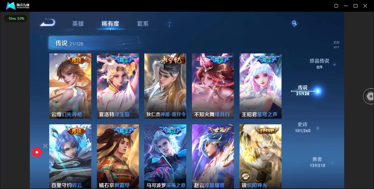 - [11471560]V7 1珍品传说 9传说 124英雄 133皮肤 可修改实名 优质装备:怪盗基德,黄金狮子座,云鹰飞将(小将军),炽阳神光,零号·赤焰,超时空战士-狄仁杰 传说皮:幻光神枪 珍宝阁皮:妄想食味 限定皮:愿照·九州拓(澜年限),影龙天霄,天狼运算者,祈雪灵祝(雪兔子),李小龙,朱雀志(守约年限) 史诗皮:鸭鸭历险记-刘禅,苍鳞隐世,器灵·浮梦炉,化蝶舞,龙之律动,石田雨龙,茶境仙,战舞者,东方月初,百相守梦-百里守约,百相守梦-黄忠,紫霞仙子,偶像歌手,魅语,节奏热浪,修罗,女仆咖啡,绅士熊喵,星夜王子,暗隐猎兽者,幽灵船长,鬼剑武藏,天秀·启明,舞动绿茵,纤云弄巧,繁星吟游(呼啦呼啦),拒霜思,乘风破浪,逐浪之夏,水晶猎龙者,曙光守护者,金属风暴,原初追逐者,圣诞狂欢,鹰眼统帅,魅力维加斯