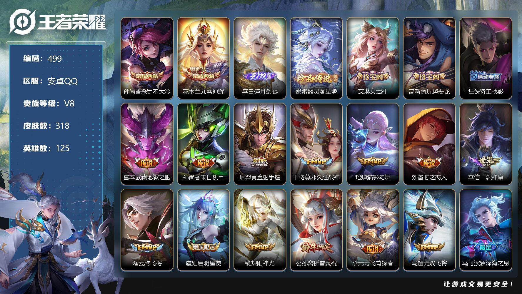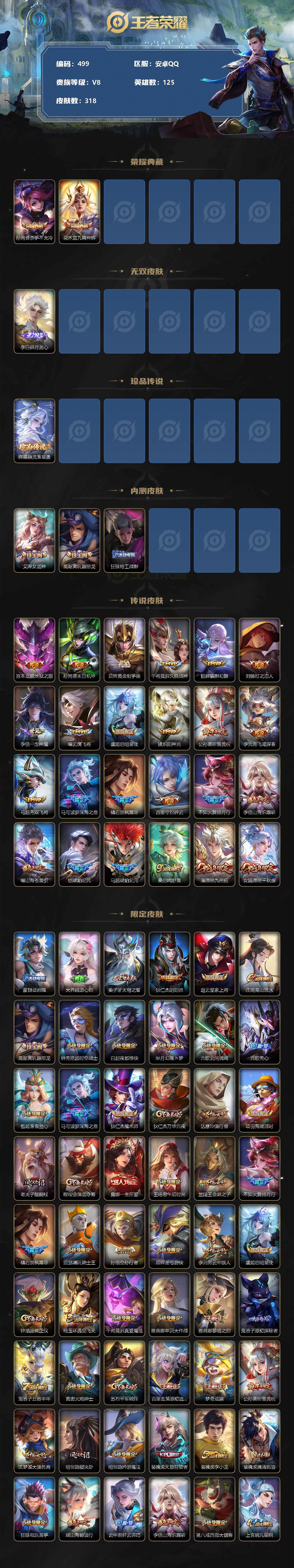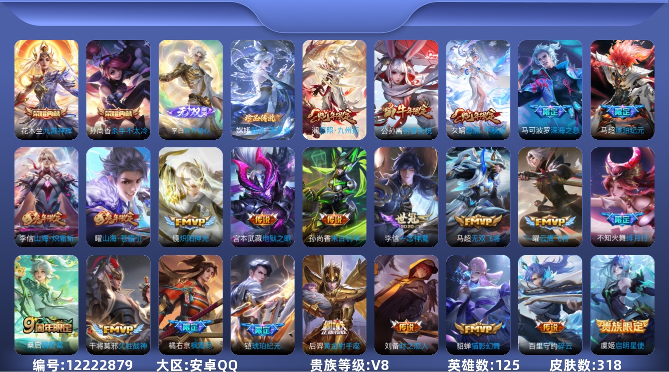 [12222879]【商品标题】:安卓Q-V8-至尊星耀IV段位-125英雄-318皮肤-2典藏-0珍品无双-1无双-1珍品传说-24传说-89史诗