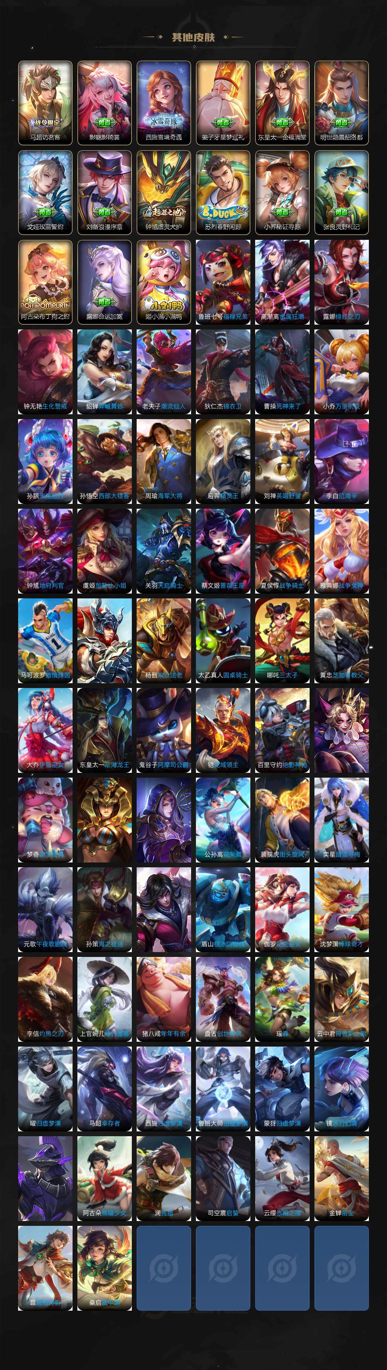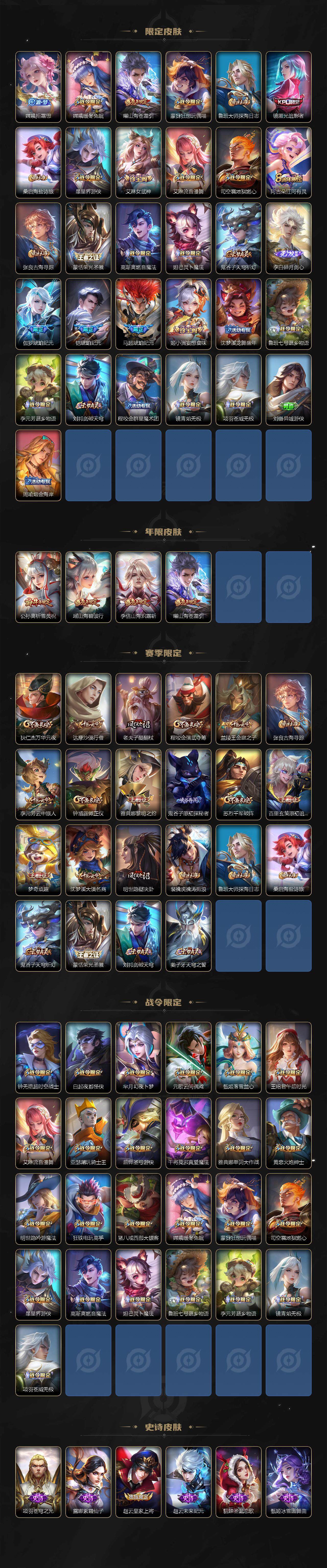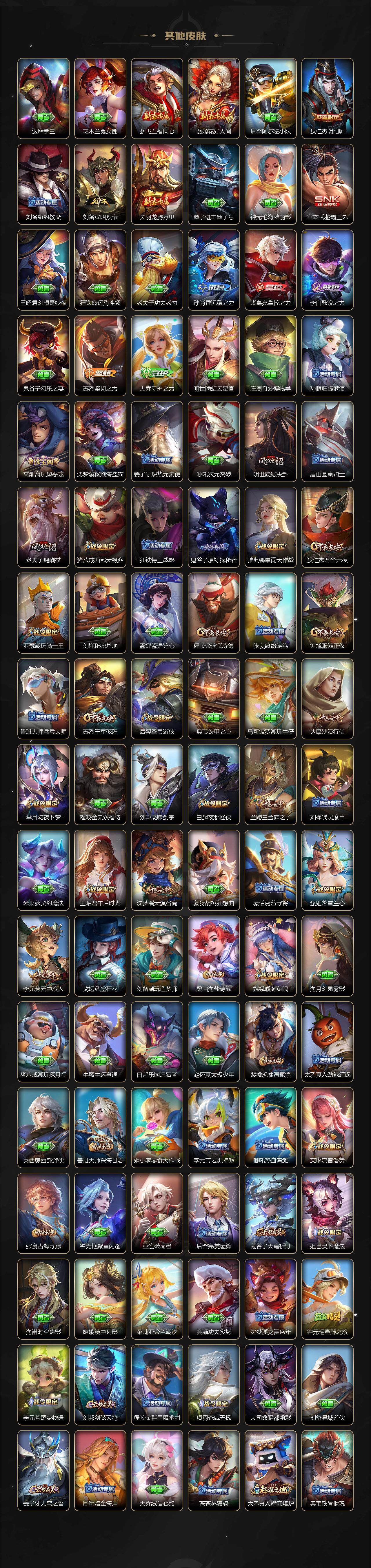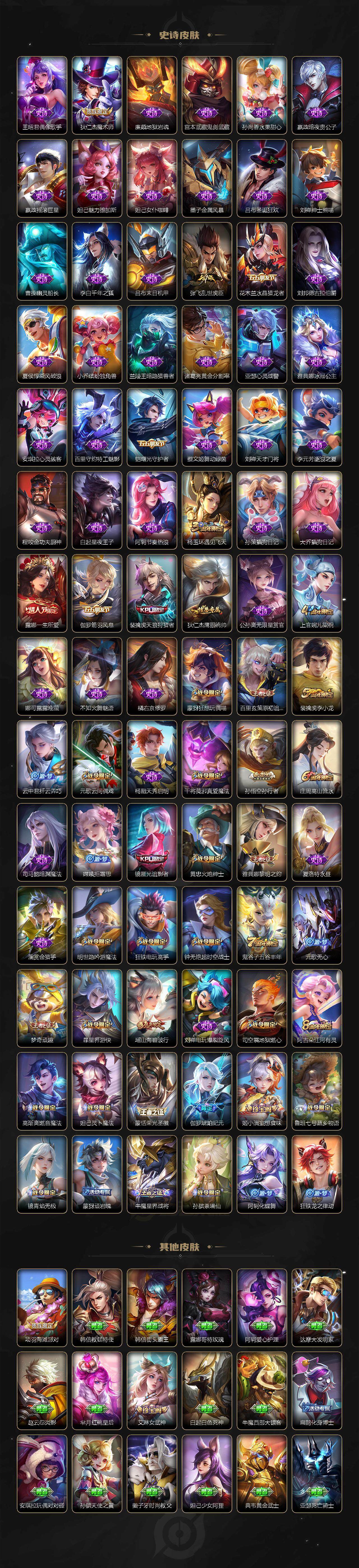 【限定皮肤】:蒙犽顽岩魄,大乔绒语心约,姜子牙天穹之誓,狄仁杰阴阳师,赵云皇家上将,庄周高山流水,高渐离玩趣恶龙,钟无艳超时空战士,白起夜都怪侠,芈月幻夜卜梦,元歌云间偶戏,元歌无心,甄姬落雪兰心,马可波罗深海之息,狄仁杰魔术师,狄仁杰万华元夜,达摩沙漠行僧,项羽海滩派对,老夫子醍醐杖,程咬金演武夺筹,露娜一生所爱,王昭君午后时光,兰陵王金庭之子,不知火舞绯月行,橘右京枫霜尽,亚瑟潮玩骑士王,孙悟空孙行者,后羿圣弓游侠,李元芳云中旅人,虞姬启明星使,钟馗驱傩正仪,杨玉环遇见飞天,干将莫邪真爱魔法,雅典娜单词大作战,雅典娜黎明之约,鬼谷子原初探秘者,鬼谷子五谷丰年,黄忠火炮绅士,苏烈千军破阵,百里玄策原初追逐者,梦奇顽趣,公孙离祈雪灵祝,沈梦溪大漠名商,明世隐疑决卦,明世隐吟游魔法,裴擒虎天狼狩猎者,裴擒虎李小龙,裴擒虎擒涛扼浪,狂铁电玩高手,瑶山海碧波行,云中君纤云弄巧,李信山海炽霜斩,猪八戒西部大镖客,上官婉儿梁祝,嫦娥拒霜思,嫦娥暖冬兔眠,曜山海苍雷引,蒙犽狂想玩偶喵,鲁班大师探海日志,镜匿光追影者,桑启海盐诗旅,暃星界游侠,艾琳女武神,艾琳流音漫舞,司空震地狱燃心,阿古朵江河有灵,张良古海寻踪,蒙恬荣光圣徽,高渐离燃音魔法,妲己灵卜魔法,鬼谷子天穹祈灯,李白碎月剑心,伽罗琥珀纪元,铠琥珀纪元,马超琥珀纪元,姬小满妄想食味,沈梦溪龙舞盛年,鲁班七号蔬乡物语,李元芳蔬乡物语,刘邦剑破天穹,程咬金群星魔术团,镜青焰无极,项羽苍威无极,刘备异域游侠,周瑜熔金海岸