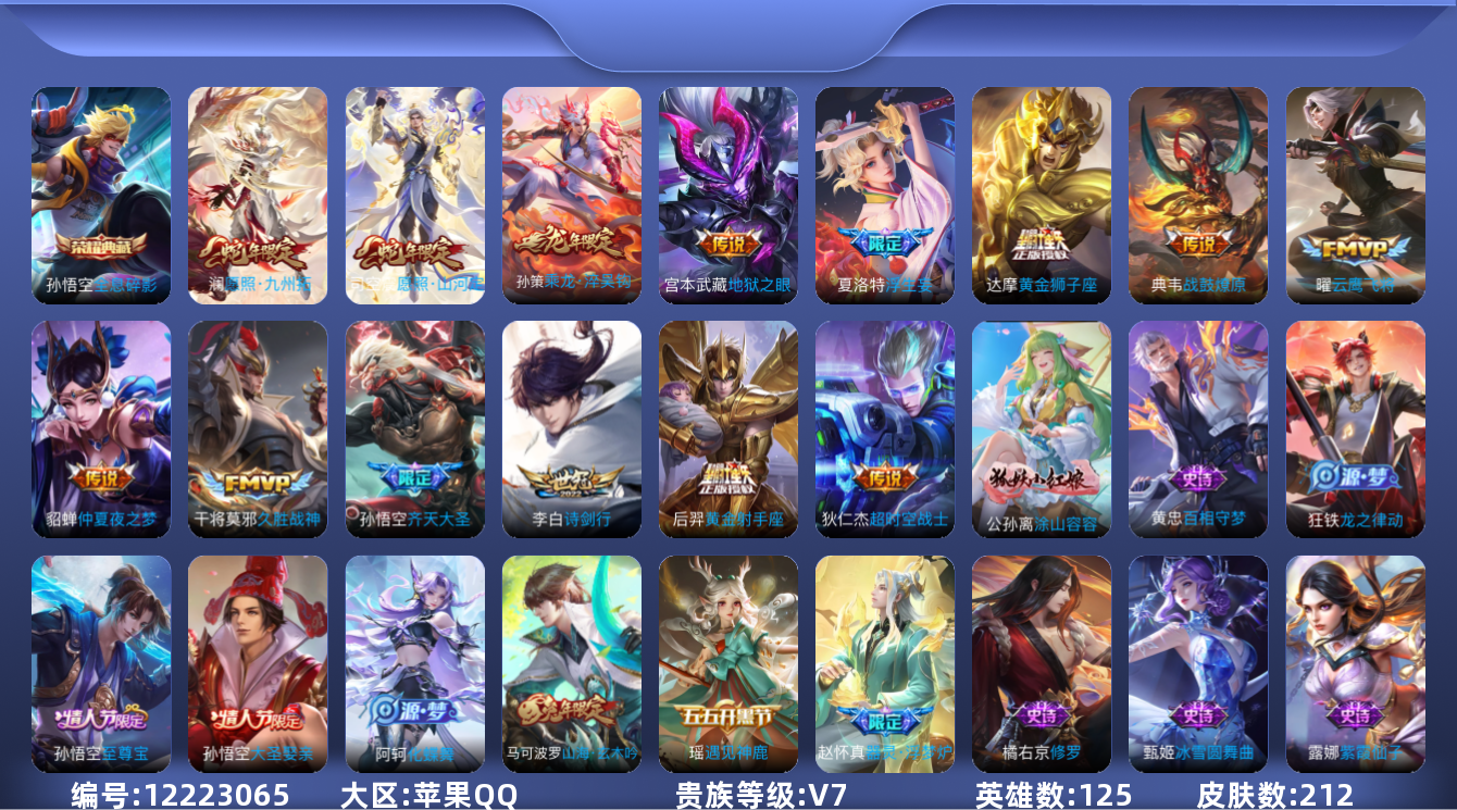 - [12085218]V7 14传说 123英雄 211皮肤 可修改实名 优质装备:冠军飞将,一念神魔,零号·赤焰,地狱之眼,飞鸢探春,山海·炽霜斩(李信年限),燃星之曲,鹤归松栖(云缨),澜逐花归海,千山共赴,涂山容容 传说皮:死亡执政官,九山相柳 珍宝阁皮:蔷薇恋人 限定皮:鸣野蒿,傲雪梅枪,飞衡(韩信年限),山海·碧波行(瑶年限),至美·乘鲤谣,齐天大圣,降魔,梁祝,天狼狩猎者,李小龙,冰霜恋舞曲 史诗皮:鸭鸭历险记-刘禅,龙之律动,百相守梦-周瑜,幻珠鲛人,琥珀纪元伽罗,决胜骁骑,百相守梦-黄忠,织梦人,守夜人,紫霞仙子,江河有灵,鹤归松栖(赵怀真),百解令(蒙犽),高渐离燃音魔法,冰冠公主,青蛇,偶像歌手,猫狗日记-孙策,时之恋人-孙尚香,修罗,摇滚巨星,水果甜心,绅士熊喵,天才门将,心灵骇客,德古拉伯爵,暗隐猎兽者,鬼剑武藏,心灵战警,诗语江南,纤云弄巧,拒霜思,乘风破浪,水晶猎龙者,曙光守护者,原初追逐者,圣诞恋歌,鹰眼统帅,王者之锤,魅力维加斯,无心,未来纪元-赵云