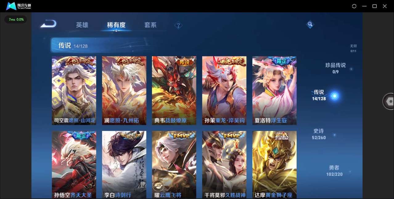 - [11688747]V7 1典藏 5传说 123英雄 217皮肤 可修改实名 优质装备:弑枪猎影(韩信典藏),云鹰飞将(小将军),零号·赤焰,超时空战士-狄仁杰 珍宝阁皮:优雅恋人,蔷薇恋人 限定皮:愿照·九州拓(澜年限),凤凰于飞,异界灵契(白毛香),神威(电光马子),飞衡(韩信年限),遇见飞天,高山流水,五谷丰年,岱宗(典韦年限),天狼绘梦者,李小龙,逐梦之影,朱雀志(守约年限),孙行者,猪悟能,青春决赛季,蜜橘之夏 史诗皮:器灵·浮梦炉,石田雨龙,茶境仙,紫霞仙子,黄金分割率,特工魅影,江河有灵,冰冠公主,偶像歌手,暗夜猫娘,龙骑士(小龙虾),末日机甲-吕布,乱世虎臣,节奏热浪,修罗,女仆咖啡,水果甜心,星夜王子,心灵骇客,功夫厨神,德古拉伯爵,暗隐猎兽者,幽灵船长,鬼剑武藏,地狱岩魂,纤云弄巧,繁星吟游(呼啦呼啦),拒霜思,乘风破浪,逐浪之夏,水晶猎龙者,箭羽风息,金属风暴,鹰眼统帅,魅力维加斯,未来纪元-赵云