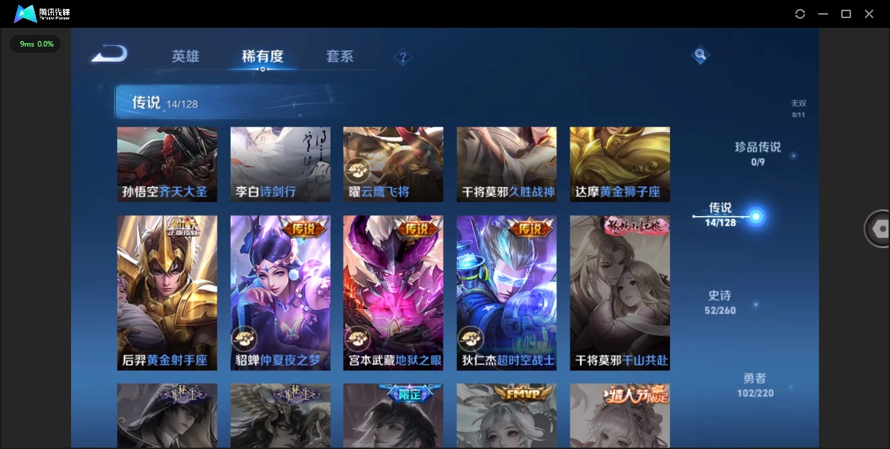 - PX_2094541-贵族等级: V8 英雄数: 125 皮肤数: 231 无双皮: 器灵·螭龙剑 珍品传说: 江户川柯南,怪盗基德,时之奇旅-孙策,器灵·落星盏,大耳狗之梦,黑崎一护 星传说: 未来机甲 传说皮: 黄金狮子座,一念神魔,末日机甲-孙尚香,地狱火,乞巧织情,游龙清影,淬星耀世,超时空战士-狄仁杰,无双飞将,浮生妄,霜月吟,澜逐花归海,落雪白狼,幻光神枪,祥瑞亨通,千劫归真,云诺千山