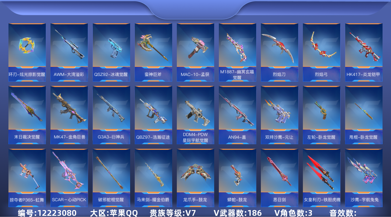 [12223080]可二次 可修改实名 V7 7王者武器 186英雄武器 3英雄角色 294万化 大师 武器:王者之影,王者之心,王者之蝶,M12S-雷霆王者,M200-幻神,AK47-奉先,M4A1-星象,M4A1-仲达,激昂霸王枪,TAC-晴舞,CZ75-策,KSG-孟获,加特林-炼狱,王者之魂,COP 357-堕天神,COP 357-雷霆,M4A1-哈迪斯,M4A1-黑龙钰-子涵,巴雷特-极光,巴雷特-毁灭,AK47-游骑兵,AK47-黑武士觉醒,AK47-燎天净火,AK47-无影,AK47-波塞冬,AK47-火麒麟,M4A1-雷神,M4A1-黑骑士,AK47-木兰,M4A1-死神,9A91-游骑兵,QBZ03-金色蔷薇,QBZ03-死神,AUG-机械纪元,81式-机械纪元,QBZ19-天使,QBB95-极光,刘易斯-天使,MK5-极光,双持斯泰尔-天使,VEPR12-宙斯,M4A1-心动次元觉醒,M4A1-破空冰刃,M4A1-海骑士,AK47-猩红传说,AK47-血武士,AK47-沙漠领主,AK47-黑鲨,M4A1-赛博雷神,AK47-华夏传说,AK12-天启,9A91-天神,SCAR-幽暗骑士,M4A1-夏清,09式狙-天神,QBZ03-玉面羞花,M14EBR-拂影,加特林-蟒蛇,加特林-堡垒,AA12-火药,地狱烈炎,嗜血金鲨,M1216-血月,黑龙魂,CBJ-MS-毒蜂,地狱火,MK47-鼓龙,HK416-极光,9A91-魔蜥觉醒,M4A1-太白诗仙,AN94-赳赳秦师,柯尔特-仲达,双管猎枪-文远,穷奇铁扇,雌雄双股剑,双持柯尔特-极光,双管猎枪-未来战士,GLOCK18-宙斯,沙鹰-修罗,沙鹰-火麒麟,沙鹰-竞技战魂,沙鹰-波塞冬,沙鹰-宇航兔兔,左轮-黑武士,沙鹰-幻兽,改装GLOCK-木兰,沙鹰-神兵修罗,擎天,三叉戟-波塞冬,马来剑-毁灭,雷霆权杖-宙斯,斩魔剑-天使,QBB95-再战涿鹿,蝴蝶刀-极光,MK47-塔罗牌觉醒,USP-神罚,迷你玉凝,麒麟刺,屠龙,唐刀-大唐荣耀,血月,星芒,蝴蝶刀-天神,女皇利刃-铁胆虎魄,黑骑士闪光弹,黑武士烟雾弹,黑武士闪光弹,黑武士手雷,烟雾弹-游骑兵,闪光弹-游骑兵,燃烧弹-游骑兵,死神手雷,死神烟雾弹,死神闪光弹,雷神闪光弹,雷神烟雾弹,雷神手雷,手雷-云海游龙,思召剑,甩棍-卧龙觉醒,马来剑-耀金伯爵