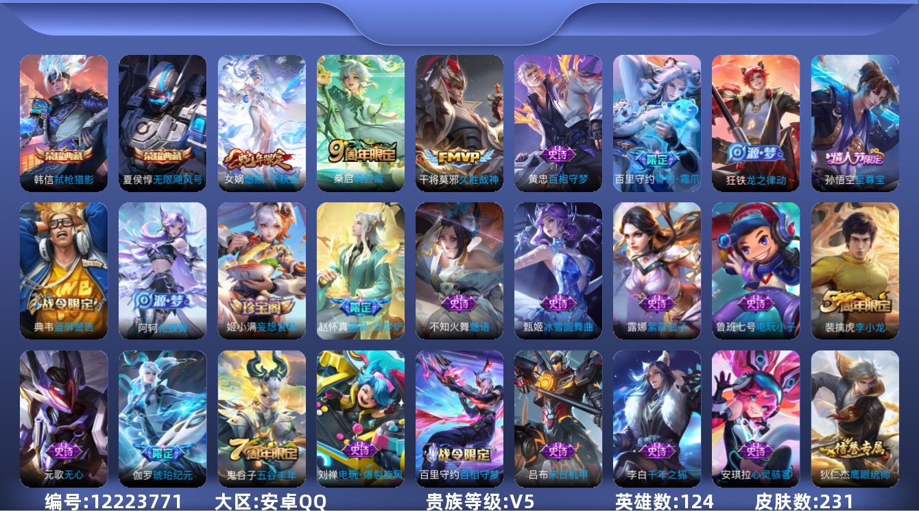[12223771]V5 2典藏 3传说 124英雄 231皮肤 可修改实名 优质装备:无限飓风号(高达),弑枪猎影(韩信典藏),久胜战神 珍宝阁皮:妄想食味,胡桃夹子,女武神 限定皮:愿照·千秋盛(女娲年限),鸣野蒿,至尊宝,高山流水,五谷丰年,李小龙 史诗皮:器灵·浮梦炉,化蝶舞,龙之律动,雪豹·霜爪,蒙犽顽岩魄,琥珀纪元伽罗,蔬乡物语(鲁班七号),百相守梦-百里守约,百相守梦-黄忠,紫霞仙子,电玩小子(小书包),黄金分割率,特工魅影,千年之狐,江河有灵,魅语,百解令(蒙犽),高渐离燃音魔法,冰冠公主,偶像歌手,电玩·爆裂旋风,末日机甲-吕布,猫狗日记-孙策,乱世虎臣,水果甜心,星夜王子,心灵骇客,鬼剑武藏,天秀·启明,舞动绿茵,地狱岩魂,乘风破浪,箭羽风息,金属风暴,原初追逐者,圣诞狂欢,鹰眼统帅,王者之锤,暗夜贵公子,魅力维加斯,黎明之约,无心