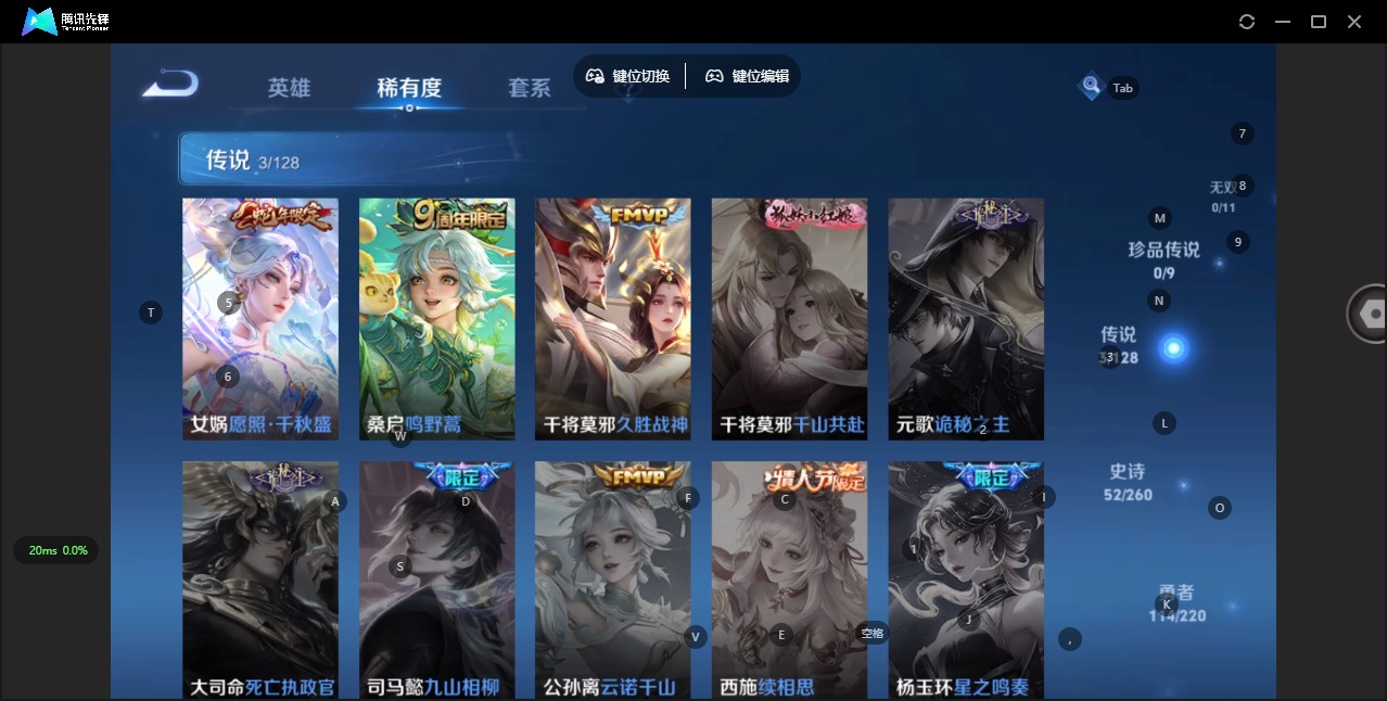 - [11684892]V6 8传说 124英雄 214皮肤 可修改实名 优质装备:猫影幻舞,炽阳神光,李逍遥,无双飞将,记忆之芯(机甲兔),澜逐花归海 珍宝阁皮:胡桃夹子,优雅恋人 限定皮:愿照·九州拓(澜年限),遇见飞天,诗剑行,五谷丰年,游园惊梦,李小龙,山海·玄木吟(马可年限) 史诗皮:器灵·浮梦炉,化蝶舞,龙之律动,战舞者,紫霞仙子,特工魅影,蒙恬荣光圣徽,晚萤,猫狗日记-孙策,乱世虎臣,修罗,摇滚巨星,水果甜心,绅士熊喵,天才门将,星夜王子,暗隐猎兽者,鬼剑武藏,地狱岩魂,纤云弄巧,繁星吟游(呼啦呼啦),乘风破浪,水晶猎龙者,金属风暴,原初追逐者,圣诞恋歌,鹰眼统帅,魅力维加斯,黎明之约,赏金猎手,滕王阁序,无心